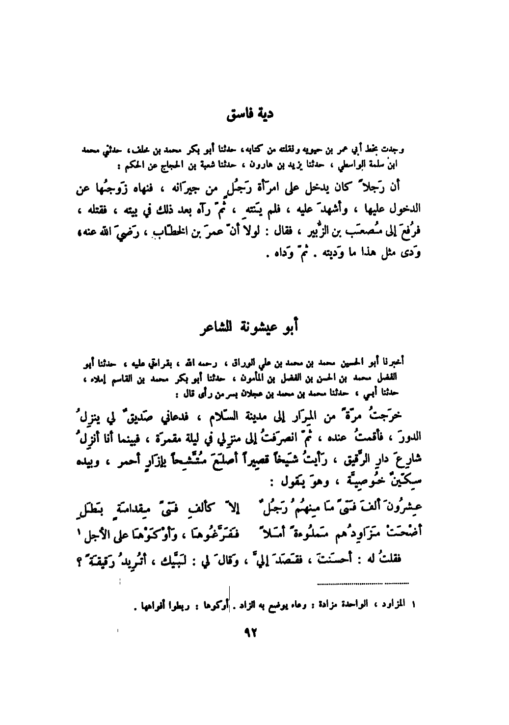 وجدت بخط أبي عمر بن حيويه ونقلته من كتابه، حدثنا أبو بكر محمد بن خلف، حدثني محمد بن سلمة الواسطي، حدثنا يزيد بن هارون، حدثنا شعبة بن الحجاج عن الحكم: أن رجلاً كان يدخل على امرأة رجل من جيرانه، فنهاه زوجها عن الدخول عليها، وأشهد عليه، فلم ينته، ثم رآه بعد ذلك في بيته، فقتله، فرفع إلى مصعب بن الزبير، فقال: لولا أن عمر بن الخطاب رضي الله عنه، ودى مثل هذا ما وديته. ثم وداه.