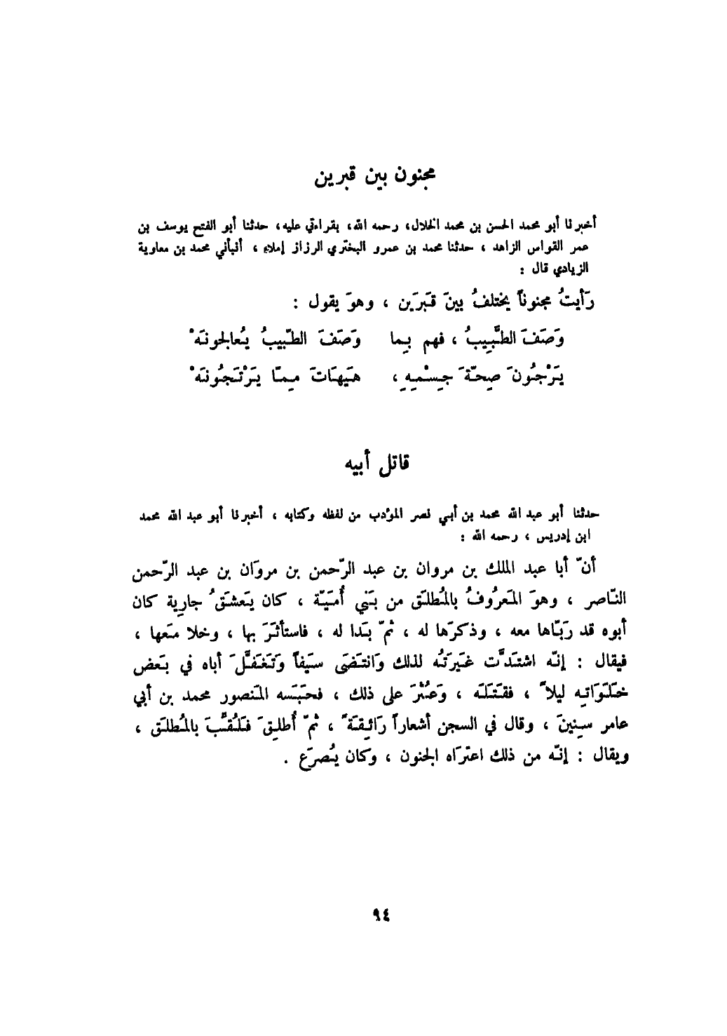 أخبرنا أبو محمد الحسن بن محمد الخلال، بقراءتي عليه، حدثنا أبو الفتح يوسف بن عمر القواس الزاهد، حدثنا محمد بن عمرو البختري الرزاز إملاء، أنبأني محمد بن معاوية الزيادي قال: رأيت مجنوناً يختلف بين قبرين، وهو يقول: