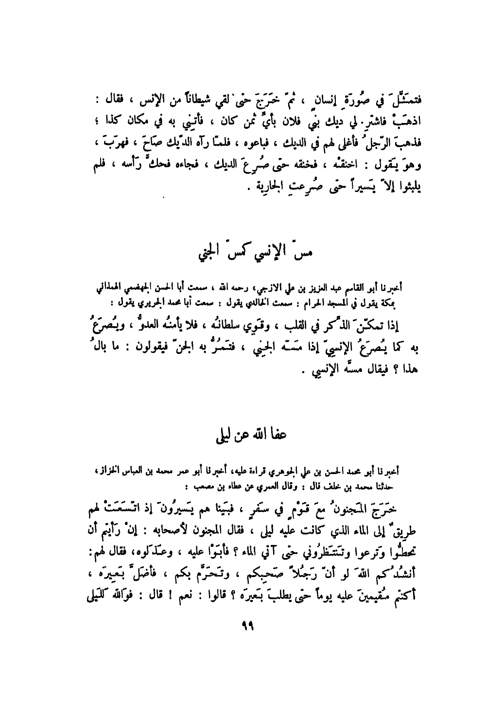 أخبرنا أبو محمد الحسن بن علي الجوهري قراءة عليه، أخبرنا أبو عمر محمد بن العباس الخزاز، حدثنا محمد بن خلف قال: وقال العمري عن عطاء بن مصعب: خرج المجنون مع قوم في سفر، فبينا هم يسيرون إذا اتسعت لهم طريق إلى الماء الذي كانت عليه ليلى، فقال المجنون لأصحابه: إن رأيتم أن تحطوا وترعوا وتنتظروني حتى آتي الماء؟ فأبوا عليه، وعذلوه، فقال لهم: أنشدكم الله لو أن رجلاً صحبكم، وتحرم بكم، فأضل بعيره، أكنتم مقيمين عليه يوماً حتى يطلب بعيره؟ قالوا: نعم! قال: فوالله لليلى
