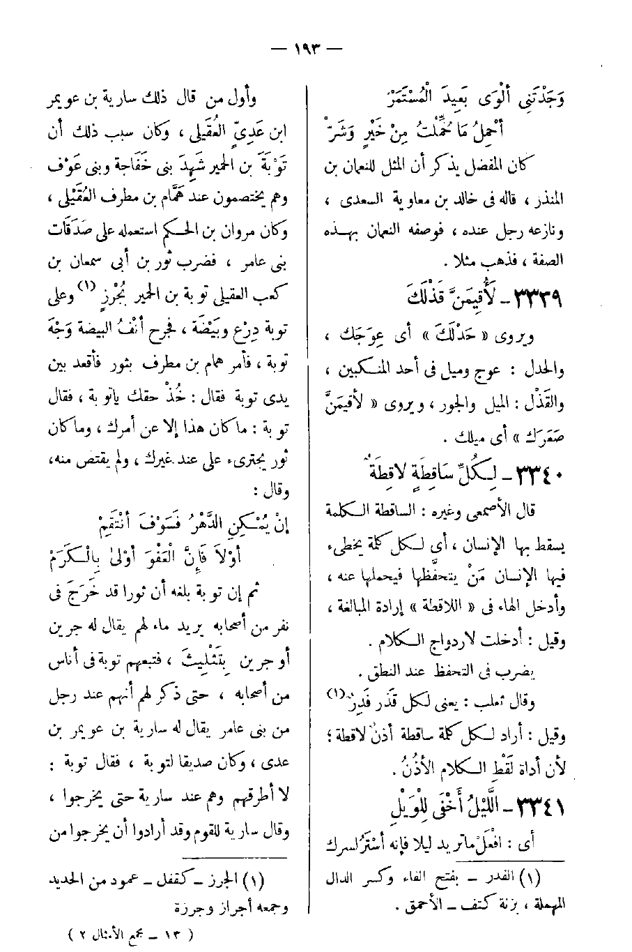 وأول من قَال ذلك سارية بن عويمر بن عَدِىٍّ العُقَيلى وكان سبب ذلك أن تَوْبَةَ بن الحمير شَهِدَ بنى خَفَاجة وبنى عَوْف وهم يختصمون عند هَمَّام بن مطرف العُقَيْلى، وكان مروان بن الحكم استعمله على صدَقَات بنى عامر، فضرب ثور بن أبى سمعان بن كعب العقيلى توبة بن الحمير بُجْرْزٍ