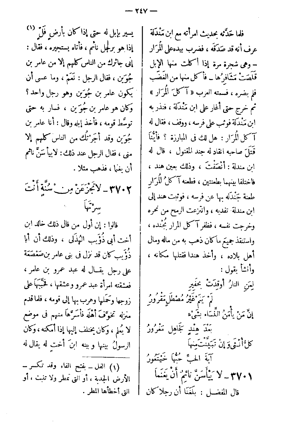 إذا هو برحل نائم، فأتاه يستجيره، فَقَالَ: آني جائرك من الناس كلهم إلاَ من عامر بن جُوَيْن، فَقَالَ الرجل: نَعَمْ، ومَا عسى أن يكون عامر بن جُوَين وهو رجلٌ واحد؟ وكان هو عامر بن جُوَين، فسار به حتى توسَّط قومه، فأخذ إبله وقَالَ: أنا عامرٌ بن جُوَين وقد أجَرْتُك من الناس كلهم إلاَ مني، فَقَالَ الرجل عند ذلك: لاَ ييأسَنَّ نائم أن يغنما، فذهب مثلاً.