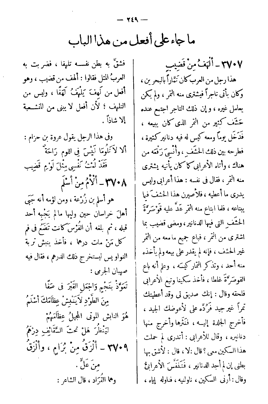 هَذا رجُلٌ منَ العربِ كانَ تَمَّاراً باليحرينِ وكانَ يأتي تاجراً فيَشتري مِنهُ التمرَ، ولم يكنْ يُعاملُ غَيرهُ، وإن ذلكَ التاجرُ اجتمعَ عِندهُ حَشَف كثيرٌ مِن التمرِ الذي كانَ يبَيعَهُ، فَدَخَل يَوماً ومَعهُ كيسٌ له فيه دَنانير كثيرةٌ، فَطرحهُ بَين ذلكَ الحشَفِ، وأُنْسِيَ رَفْعَة منْ هُناكَ، وأتاه الأَعرَبي كما كانَ يأتيه يشتري مِنهُ التَمرَ، فَقَالَ في نفسه: هذا أعرابي وليسَ يدري ما أعطيه، فلاَ صيرن هذا الحشفَ فيما يبتاعه، فلما ابتاعَ مِنهُ التمر عَدَّ عليه قَوْصَرَّةَ الحشَفِ التي فيها الدَنانير، ومضى قضيب بما اشترى منَ التمرِ، فباع جميعَ ما معه من التمر غير الحشف، فإنه لم يقدر على بيعهِ ولمْ يأخذه منهُ أحدٌ، وتذكر التمار كيسَه، وعلم أنه باع القَوصَرَّةَ غلطاً، فأخذ سكيناً وتبع الأَعرَبي فلحقهُ وقَالَ: إنكَ صديقٌ لي وقد أعطيتكَ تمراً غير جيد فَرُدَّه علي لأعوضك الجيد، فأخرجَ الجِلدة إليه، فنَثَرها وأخرجَ منها دنانيرهُ، وقَالَ للأعرابي: أتدري لم حملتُ هذا السكين معي؟ قَالَ: لاَ، قَالَ: لأشق بها بَطني إن لمْ أجد الدنانير، فَتَنَفَّسَ الأَعرَبي وقَالَ: أرني السكين، ناولنيه، فناوله إياه، فشقَّ به بطن نفسه تلهفاً، فضربت به العربُ المثل فَقَالَوا: ألهف من قضيب، وهو أفعل من لَهِفُ يَلْهَفُ لهفاً، وليس من التلهف؛ لاَن أفعل لاَ ينبني من المنشعبةَ إلاَ شاذاً.