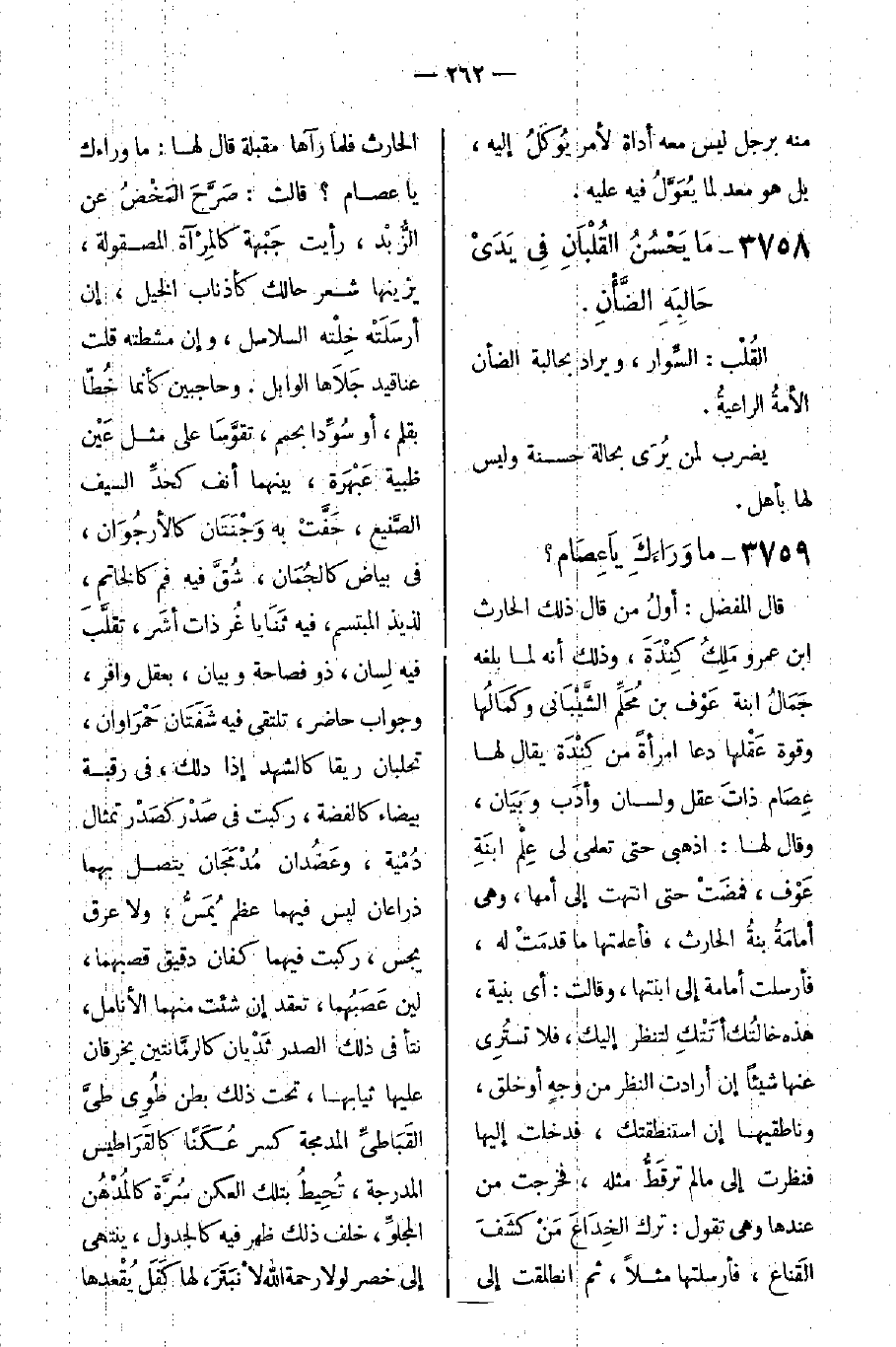 تحلبان ريقاً كالشهد إذا دلك، في رقبة بيضاء كالفضة، ركبت في صَدرْ كصَدْر تمثال دُمْية، وعَضُدان مُدْمَجَان يتصل بها ذراعان ليس فيهما عظم يُمَسُّ، ولاَ عرق يجس، ركبت فيهما كفان دقيق قصبهما لين عَصَبُهُما، تعقد إن شيءت منهما الأنامل، نتأ في ذلك الصدر ثَدْيان كالرمَّانتين يخرقان عليها ثيابها، تحت ذلك بطن طُوِى طيَّ القَبَاطيِّ المدمجة كسر عُكَناً كالقَرَاطيس المدرجة، تُحِيطُ بتلك العكن سُرَّة كالمُدْهُن المجلوِّ، خلف ذلك ظهر فيه كالجدول، ينتهي إلى حضر لولاَ رحمة الله لاَ نَبَتَرَ، لها كفَلُ يُقْعدها -[263]- إذا نهضَت وينهضها إذا قعدت، كأنه دِعْصُ الرَّمْل لَبَّده سقوط الطَّلَّ، يحمله فَخِذَانِ لُفَّا كأنما قلبا على نَضَد جُمَان، تحتهما ساقان خَدْلَتَان كالبرديتين وُشِّيتا بشعر أسود كأنه حلق الزرد، يحمل ذلك قَدَمَان كحذو اللسان، فتبارك الله مع صغرهما كيف تطيقان حمل ما فوقهما، فأرسل الملك إلى أبيها فخطبها، فزوجها إياه، وبعث بصداقها، فجهزت، فلما أراد أن يحملوها إلى زوجها قَالَت لها أمها: أي بنية، إن الوصية لو تُرِكت لِفَضلِ أدبٍ تُرِكت لذلك منك، ولكنها تذكرة للغافل، ومَعُونة للعاقل، ولو أن امرأة استغنت عن الزوج لِغِنَي أبويها وشدَّة حاجتهما إليها كنتِ أغنى الناس عنه، ولكن النساء للرجال خلقْنَ، ولهن خلق الرجال. أي بنية، إنك فَارقْتِ الجوَّ الذي منه خَرَجْتِ، وخَلَّفْتِ العُشَّ الذي فيه دَرَجْتِ، إلى وَكْر لم تعرفيه، وقَرِين لم تألفيه، فأصبح بملكه عليك رقيباً ومليكا، فكونِي له أمَةً يكُنْ لك عبداً وَشِيكا، يا بنية احْمِلِي عنى عَشْرَ خِصَالٍ تكن لك ذُخْراً وذِكْراً: