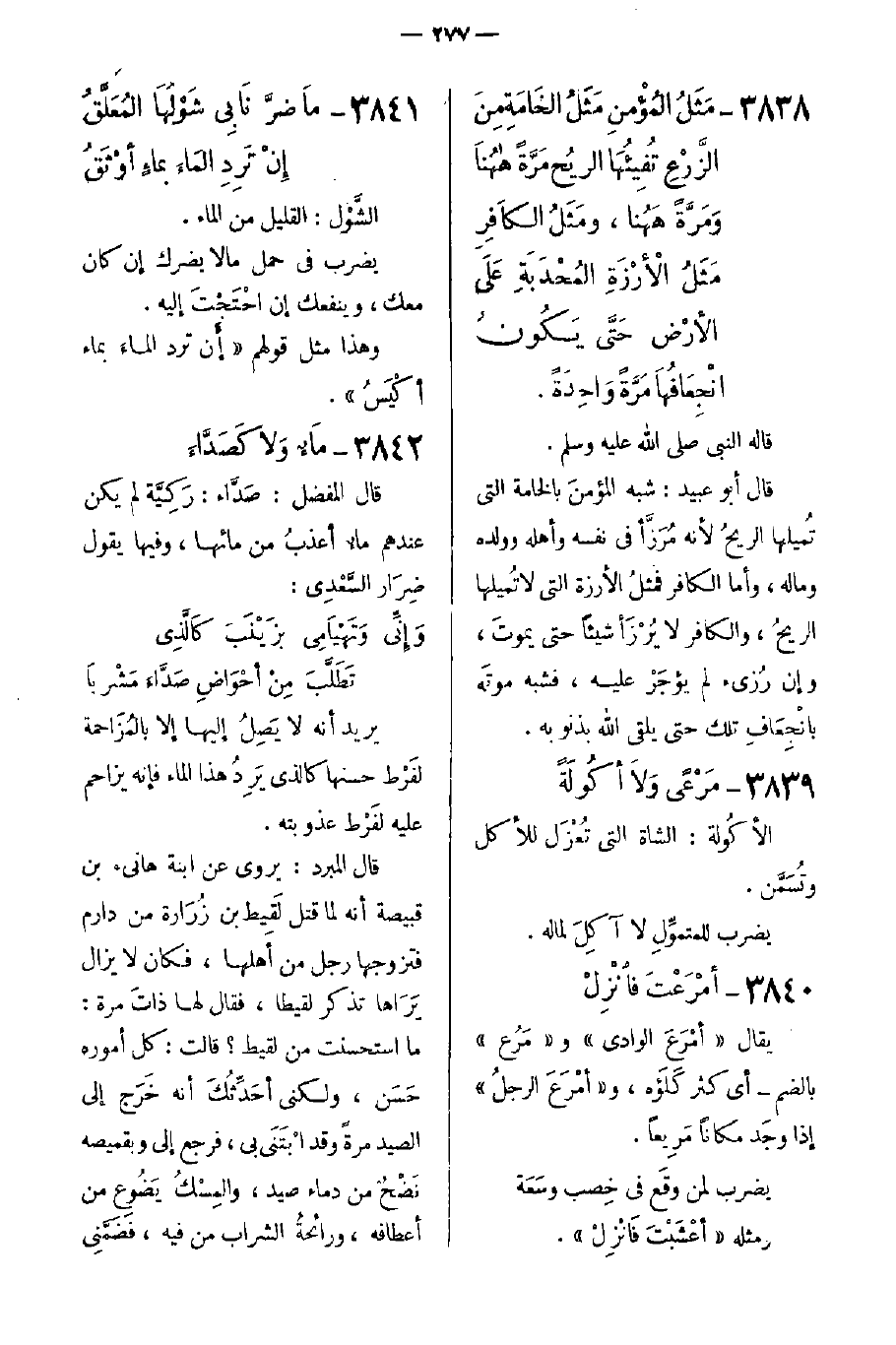 3838- مَثَلُ المُؤْمنِ مَثَلُ الخَامَةِ مِنَ الزَّرْعِ تُفِيئُهَا الريْح مَرَّة ههُنَا وَمَرَّةً هَهُنَا، ومثَلُ الكافِرِ مَثَلُ الأرزة المُحْدَبَةِ عَلَى الأَرض حتَّى يَكُونُ انْجِعَافُهَا مَرَّة وَاحِدَةً.
