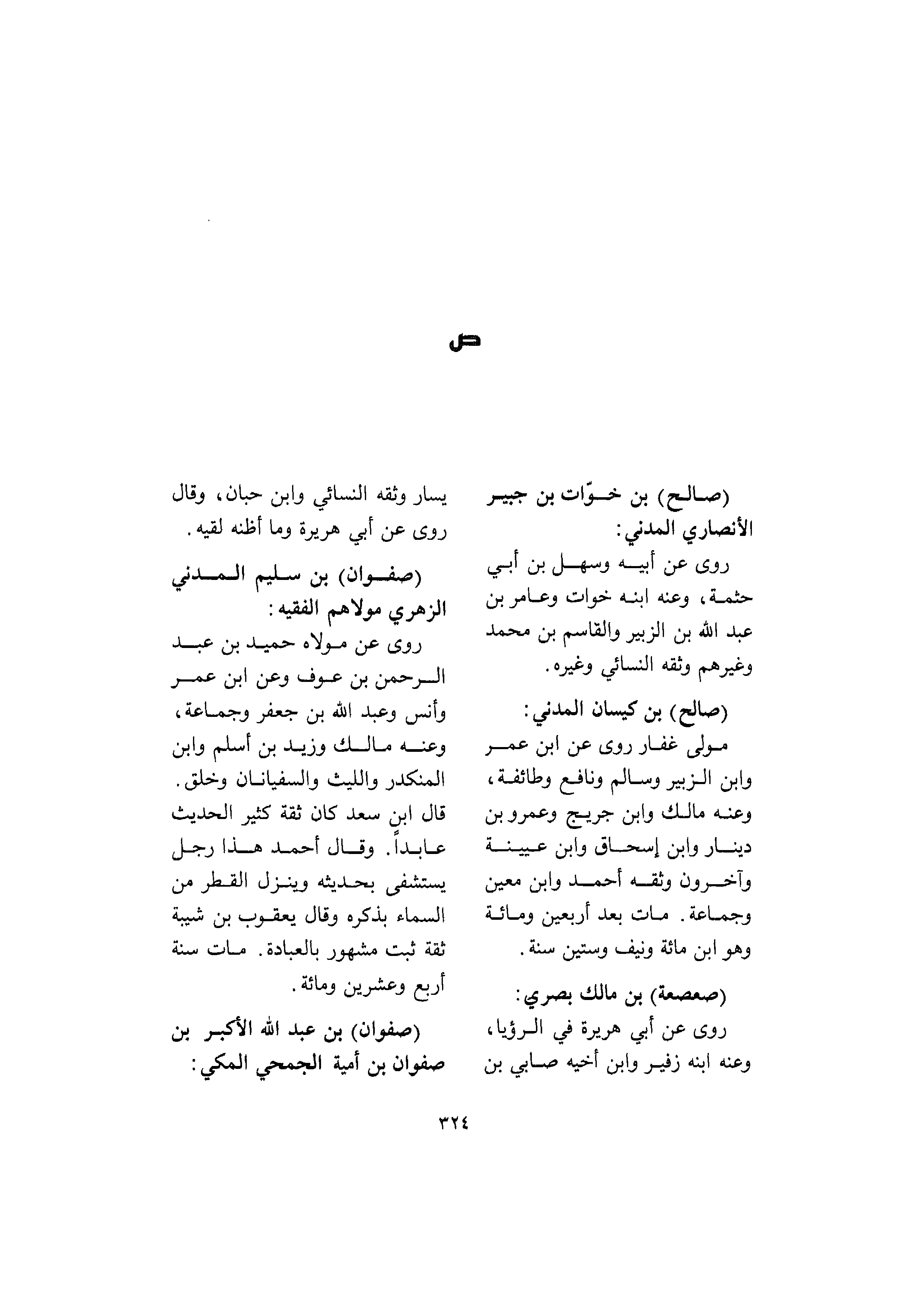صالح بن خوات بن جبير الأنصاري المدني روى عن أبيه وسهل بن أبي حثمة وعنه ابنه خوات وعامر بن عبد الله بن الزبير والقاسم بن محمد وغيرهم وثقه النسائي وغيره صالح بن كيسان المدني مولى غفار عن بن عمر وابن الزبير وسالم ونافع وطائفة وعنه مالك وابن جريج وعمرو بن دينار وابن إسحاق وابن عيينة وآخرون وثقه أحمد وابن معين وجماعة مات بعد أربعين ومائة وهو بن مائة ونيف وستين سنة صعصعة بن مالك بصري روى عن أبي هريرة في الرؤيا وعنه ابنه زفير وابن أخيه صابىء بن يسار وثقه النسائي وابن حبان وقال روى عن أبي هريرة وما أظنه لقيه صفوان بن سليم المدني الزهري مولاهم الفقيه روى عن مولاه حميد بن عبد الرحمن بن عوف وعن بن عمر وأنس وعبد الله بن جعفر وجماعة وعنه مالك وزيد بن أسلم وابن المنكدر والليث والسفيانان وخلق قال بن سعد كان ثقة كثير الحديث عابدا وقال أحمد هذا رجل يستشفي بحديثه وينزل القطر من السماء بذكره وقال يعقوب بن شيبة ثقة ثبت مشهور بالعبادة مات سنة أربع وعشرين ومائة صفوان بن عبد الله الأكبر بن صفوان بن أمية الجمحي المكي §