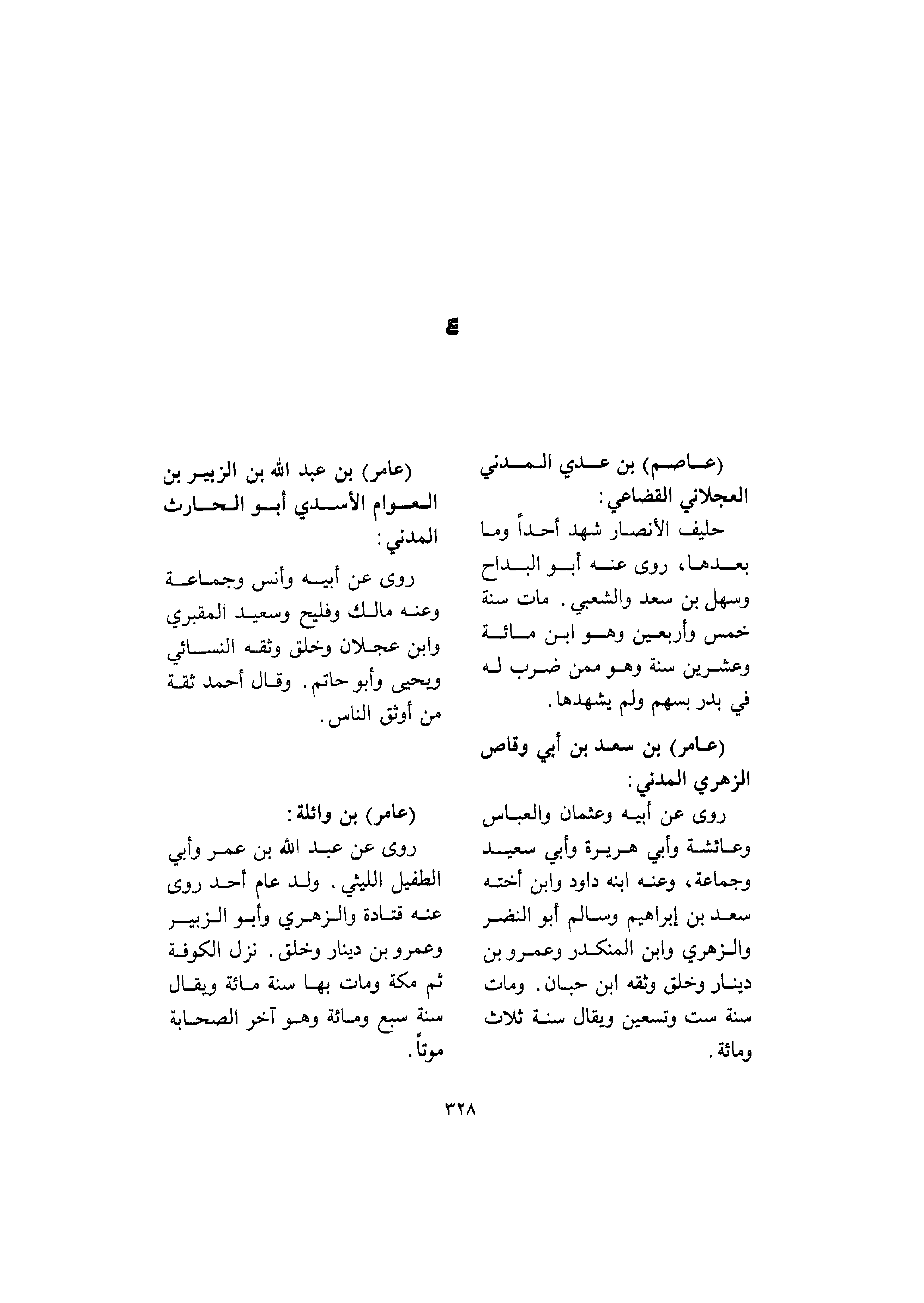 عاصم بن عدي المدني العجلاني القضاعي حليق الأنصار شهد أحدا وما بعدها روى عنه أبو البداح وسهل بن سعد والشعبي مات سنة خمس وأربعين وهو بن مائة وعشرين سنة وهو ممن ضرب له في بدر بسهم ولم يشهدها عامر بن سعد بن أبي وقاص الزهري المدني روى عن أبيه وعثمان والعباس وعائشة وأبي هريرة وأبي سعيد وجماعة وعنه ابنه داود وابن أخته سعد بن إبراهيم وسالم أبو النضر والزهري وابن المنكدر وعمرو بن دينار وخلق وثقه بن حبان ومات سنة ست وتسعين ويقال سنة ثلاث ومائة عامر بن عبد الله بن الزبير بن العوام الأسدي أبو الحارث المدني روى عن أبيه وأنس وجماعة وعنه مالك وفليح وسعيد المقبري وابن عجلان وخلق وثقه النسائي ويحيى وأبو حاتم وقال أحمد ثقة من أوثق الناس عامر بن واثلة روى عن عبد الله بن عمر وأبي الطفيل الليثي ولد عام أحد روى عنه قتادة والزهري وأبو الزبير وعمرو بن دينار وخلق نزل الكوفة ثم مكة ومات بها سنة مائة ويقال سنة سبع ومائة وهوآخر الصحابة موتا §