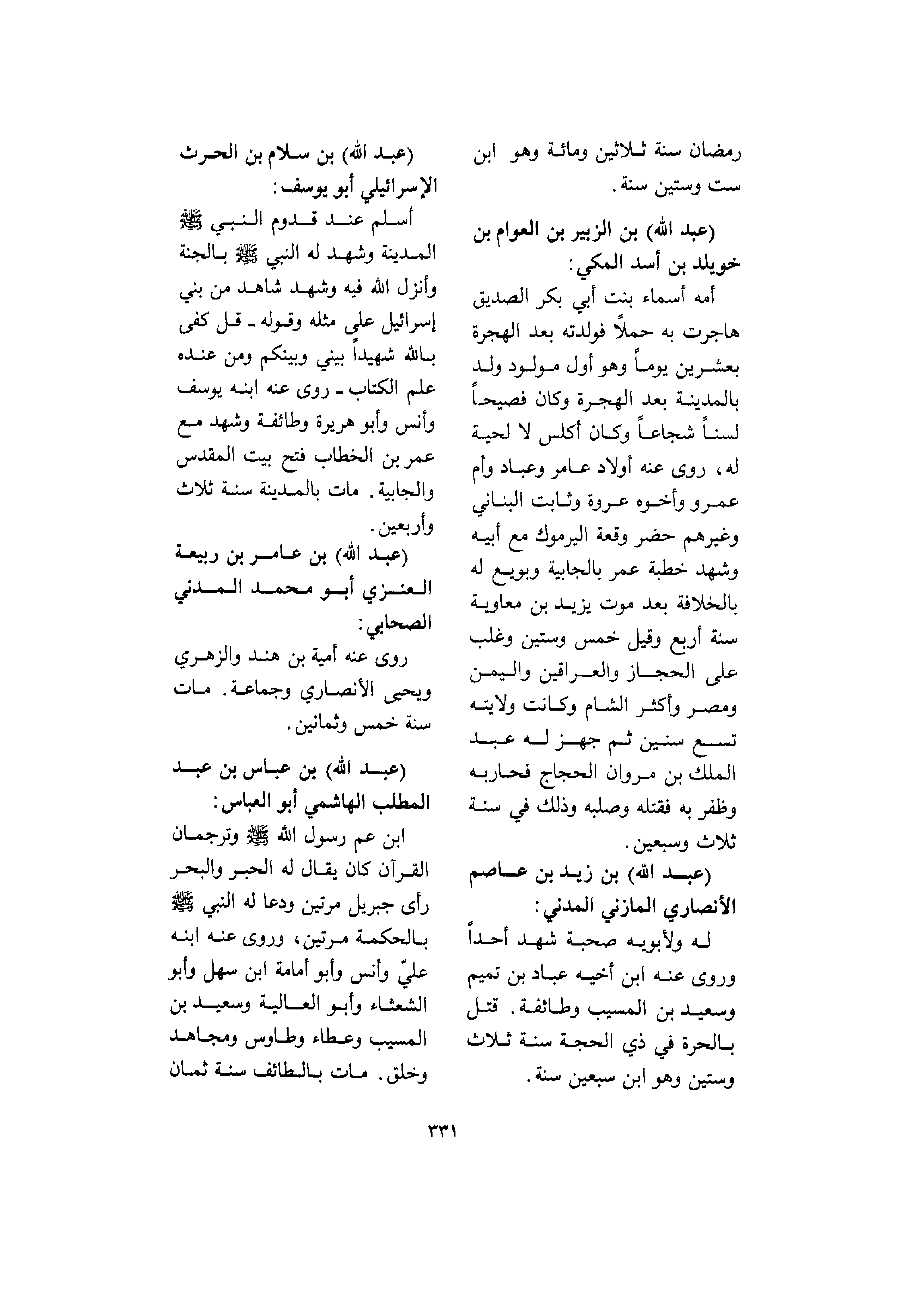 <331> رمضان سنة ثلاثين ومائة وهو بن ست وستين عبد الله بن الزبير بن العوام بن خويلد بن أسد المكي أمه أسماء بنت أبي بكر الصديق هاجرت به حملا فولدته بعد الهجرة بعشرين شهرا وهو أول مولود ولد بالمدينة بعد الهجرة وكان فصيحا لسنا شجاعا وكان أكلس لا لحية له روى عنه أولاده عامر وعباد وأم عمرو وأخوه عروة وثابت البناني وغيرهم حضر وقعة اليرموك مع أبيه وشهد خطبة عمر بالجابية وبويع له بالخلافة بعد موت يزيد بن معاوية سنة أربع وقيل خمس وستين وغلب على الحجاز والعراقين واليمن ومصر وأكثر الشام وكانت ولايته تسع سنين ثم جهز له عبد الله بن مروان الحجاج فحاربه وظفر به فقتله وصلبه وذلك في سنة ثلاث وسبعين عبد الله بن زيد بن عاصم الأنصاري المازني المدني له ولأبويه صحبة شهد أحدا وروى عنه بن أخيه عباد بن تميم وسعيد بن المسيب وطائفة قتل بالحرة في ذي الحجة سنة ثلاث وستين وهو بن سبعين سنة عبد الله بن سلام بن الحرث الإسرائيلي أبو يوسف أسلم عند قدوم النبي صلى الله عليه و سلم المدينة وشهد له النبي صلى الله عليه و سلم بالجنة وأنزل الله فيه وشهد شاهد من بني إسرائيل على مثله وقوله قل كفى بالله شهيدا بيني وبينكم ومن عنده علم الكتاب روى عنه ابنه يوسف وأنس وأبو هريرة وطائفة وشهد مع عمر بن الخطاب فتح بيت المقدس والجابية مات بالمدينة سنة ثلاث وأربعين عبد الله بن عامر بن ربيعة العنزي أبو محمد المدني الصحابي روى عنه أمية بن هند الزهري ويحيى الأنصاري وجماعة مات سنة خمس وثمانين عبد الله بن عباس بن عبد المطلب الهاشمي أبو العباس بن عمر رسول الله صلى الله عليه و سلم وترجمان القرآن كان يقال له الحبر والبحر رأى جبريل مرتين ودعا له النبي صلى الله عليه و سلم بالحكمة مرتين وروى عنه ابنه علي وأنس وأبو أمامة بن سهل وأبو الشعثاء وأبو العالية وسعيد بن المسيب وعطاء وطاوس ومجاهد وخلق مات بالطائف سنة ثمان §