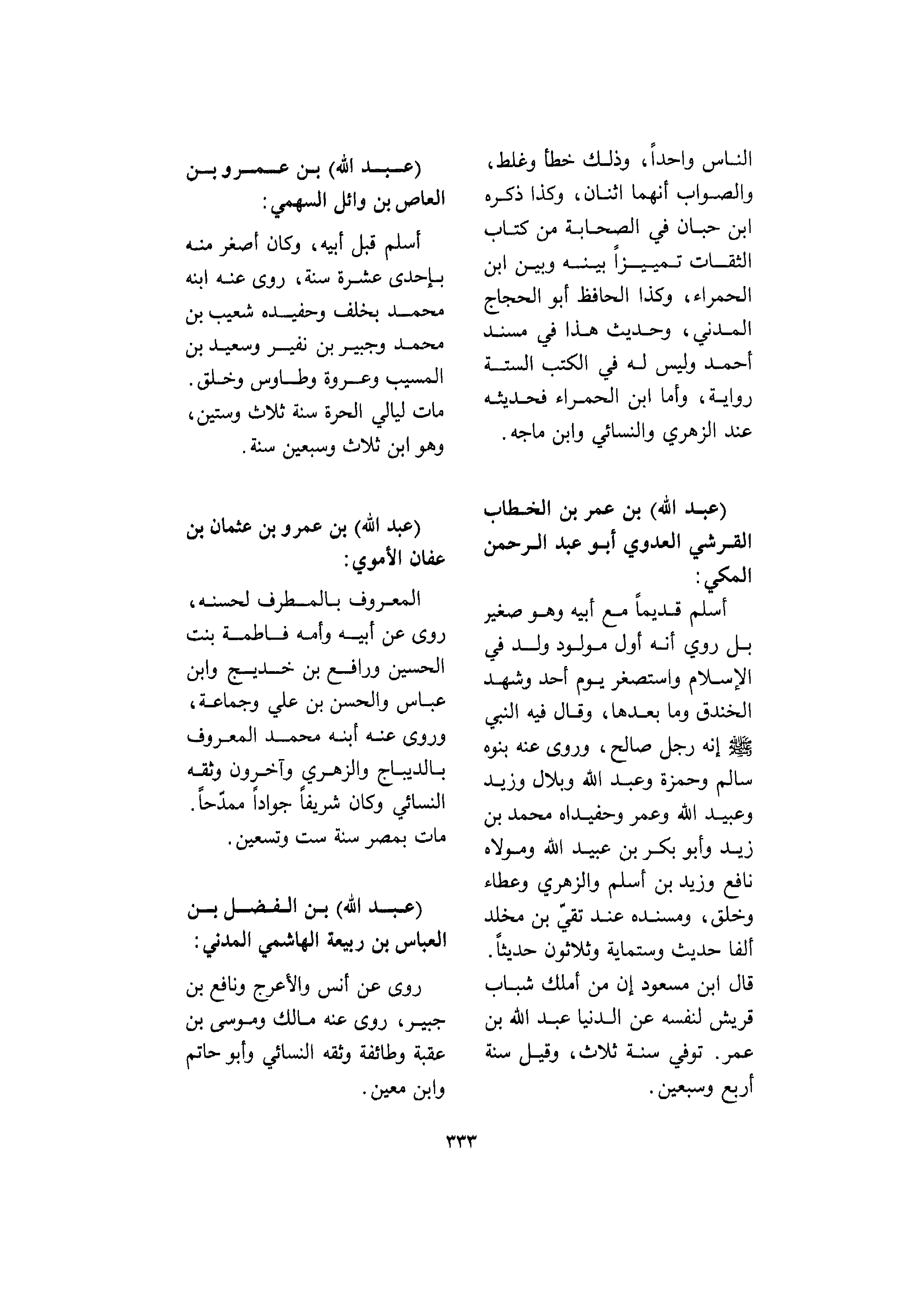 <333> الناس واحدا وذلك خطأ وغلط والصواب أنهما اثنان وكذا ذكره بن حبان في الصحابة من كتاب الثقات تمييزا بينه وبين بن الحمراء وكذا الحافظ أبو الحجاج المدني وحديث هذا في مسند أحمد وليس له في الكتب الستة رواية وأما بن الحمراء فحديثه عند الزهري والنسائي وابن ماجة عبد الله بن عمر بن الخطاب القرشي العدوي أبو عبد الرحمن المكي أسلم قديما مع أبيه وهو صغير بل روي أنه أول مولود ولد في الإسلام واستصغر يوم أحد وشهد الخندق وما بعدها وقال فيه النبي صلى الله عليه و سلم إنه رجل صالح وروى عنه بنوه سالم وحمزة وعبد الله وبلال وزيد وعبيد الله وعمر وحفيداه محمد بن زيد وأبو بكر بن عبيد الله ومولاه نافع وزيد بن أسلم والزهري وعطاء وخلق ومسنده عن تقي بن مخلد ألفا حديث وستمائة وثلاثون حديثا قال بن مسعود إن من أملك شباب قريش لنفسه عن الدنيا عبد الله بن عمر توفي سنة ثلاث وقيل سنة أربع وسبعين عبد الله بن عمرو بن العاصي بن وائل السهمي أسلم قبل أبيه وكان أصغر منه بإحدى عشرة سنة روى عنه ابنه محمد بخلف وحفيده شعيب بن محمد وجبير بن نفير وسعيد بن المسيب وعروة وطاوس وخلق مات ليالي الحرة سنة ثلاث وستين وهو بن ثلاث وسبعين سنة عبد الله بن عمرو بن عثمان بن عفان الأموي المعروف بالمطرف لحسنه روى عن أبيه وأمه فاطمة بنت الحسين ورافع بن خديج وابن عباس والحسن بن علي وجماعة وروى عنه ابنه محمد المعروف بالديباج والزهري وآخرون وثقه النسائي وكان شريفا جوادا ممدحا مات بمصر سنة ست وتسعين عبد الله بن الفضل بن العباس بن ربيعة الهاشمي المدني روى عن أنس والأعرج ونافع بن جبير روى عنه مالك وموسى بن عقبة وطائفة وثقه النسائي وأبو حاتم وابن معين §