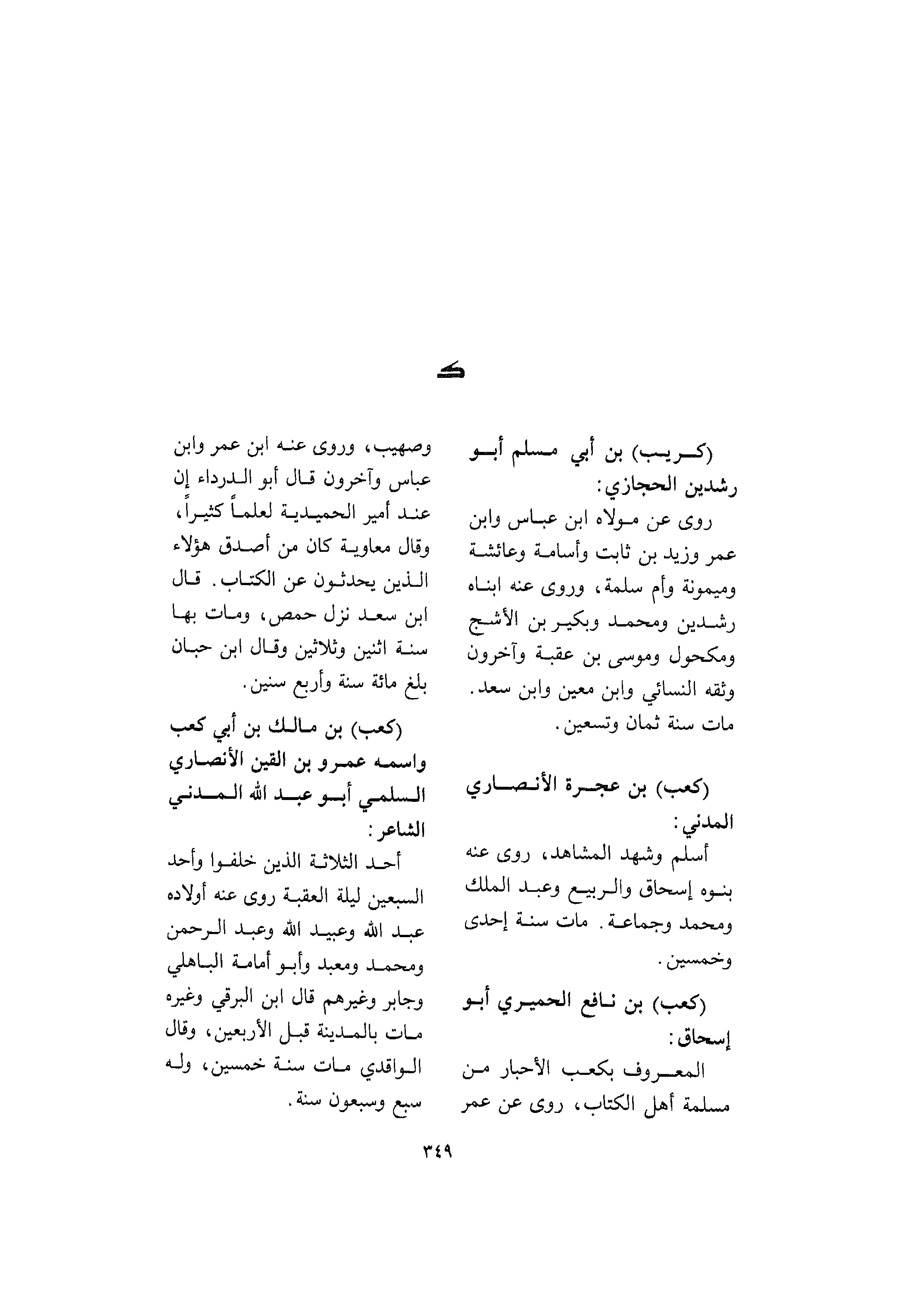 كريب بن أبي مسلم أبو رشدين الحجازي روى عن مولاه بن عباس وابن عمر وزيد بن ثابت وأسامة وعائشة وميمونة وأم سلمة وروى عنه ابناه رشدين ومحمد وبكير بن الأشج ومكحول وموسى بن عقبة وآخرون وثقه النسائي وابن معين وابن سعد مات سنة ثمان وتسعين كعب بن عجرة الأنصاري المدني أسلم وشهد المشاهد روى عنه بنوه إسحاق والربيع وعبد الملك ومحمد وجماعة مات سنة إحدى وخمسين كعب بن نافع الحميري أبو إسحاق المعروف بكعب الأحبار من مسلمة أهل الكتاب روى عن عمر وصهيب وروى عنه بن عمر وابن عباس وآخرون قال أبو الدرداء إن عند أمير الحميدية لعلما كثيرا وقال معاوية كان من أصدق هؤلاء الذين يحدثون عن الكتاب قال بن سعد نزل حمص ومات بها سنة اثنين وثلاثين وقال بن حبان بلغ مائة سنة وأربع سنين كعب بن مالك بن أبي كعب واسمه عمرو بن القين الأنصاري السلمي أبو عبد الله المدني الشاعر أحد الثلاثة الذين خلفوا وأحد السبعين ليلة العقبة روى عنه أولاده عبد الله وعبيد الله وعبد الرحمن ومحمد ومعبد وأبو أمامة الباهلي وجابر وغيرهم قال بن البرقي وغيره مات بالمدينة قبل الأربعين وقال الواقدي مات سنة خمسين وله سبع وسبعون سنة §