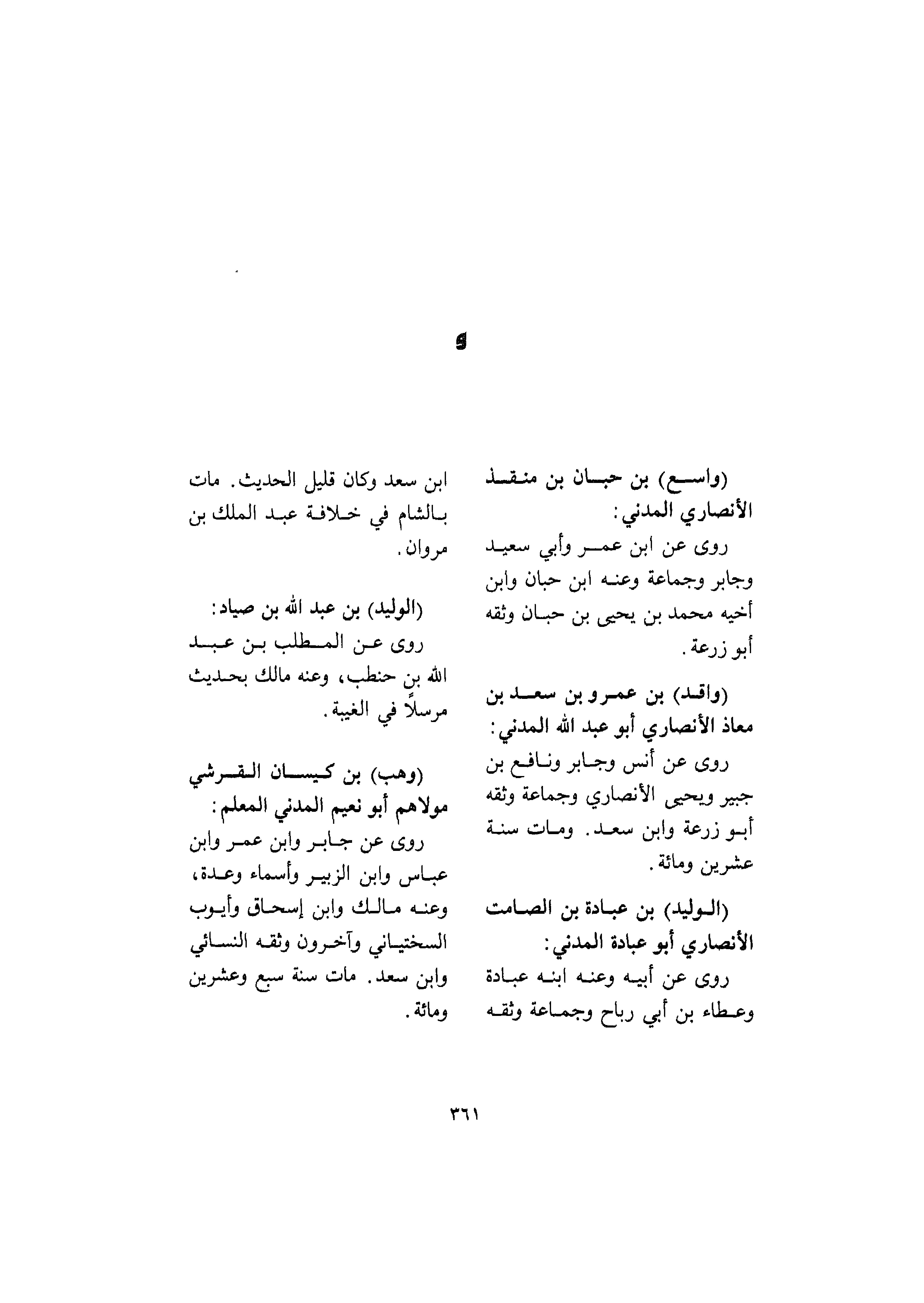 واسع بن حبان بن منقذ الأنصاري المدني روى عن بن عمر وأبي سعيد وجابر وجماعة وعنه بن حبان وابن أخيه محمد بن يحيى بن حبان وثقه أبو زرعة واقد بن عمرو بن سعد بن معاذ الأنصاري أبو عبد الله المدني روى عن أنس وجابر ونافع بن جبير ويحيى الأنصاري وجماعة وثقه أبو زرعة وابن سعد ومات سنة عشرين ومائة الوليد بن عبادة بن الصامت الأنصاري أبو عبادة المدني روى عن أبيه وعنه ابنه عبادة وعطاء بن أبي رباح وجماعة وثقه بن سعد وكان قليل الحديث مات بالشام في خلافة عبد الملك بن مروان الوليد بن عبد الله بن صياد روى عن المطلب بن عبد الله بن حنطب وعنه مالك بحديث مرسلا في الغيبة وهب بن كيسان القرشي مولاهم أبو نعيم المدني المعلم روى عن جابر وابن عمر وابن عباس وابن الزبير وأسماء وعدة وعنه مالك وابن إسحاق وأيوب السختياني وآخرون وثقه النسائي وابن سعد مات سنة سبع وعشرين ومائة §