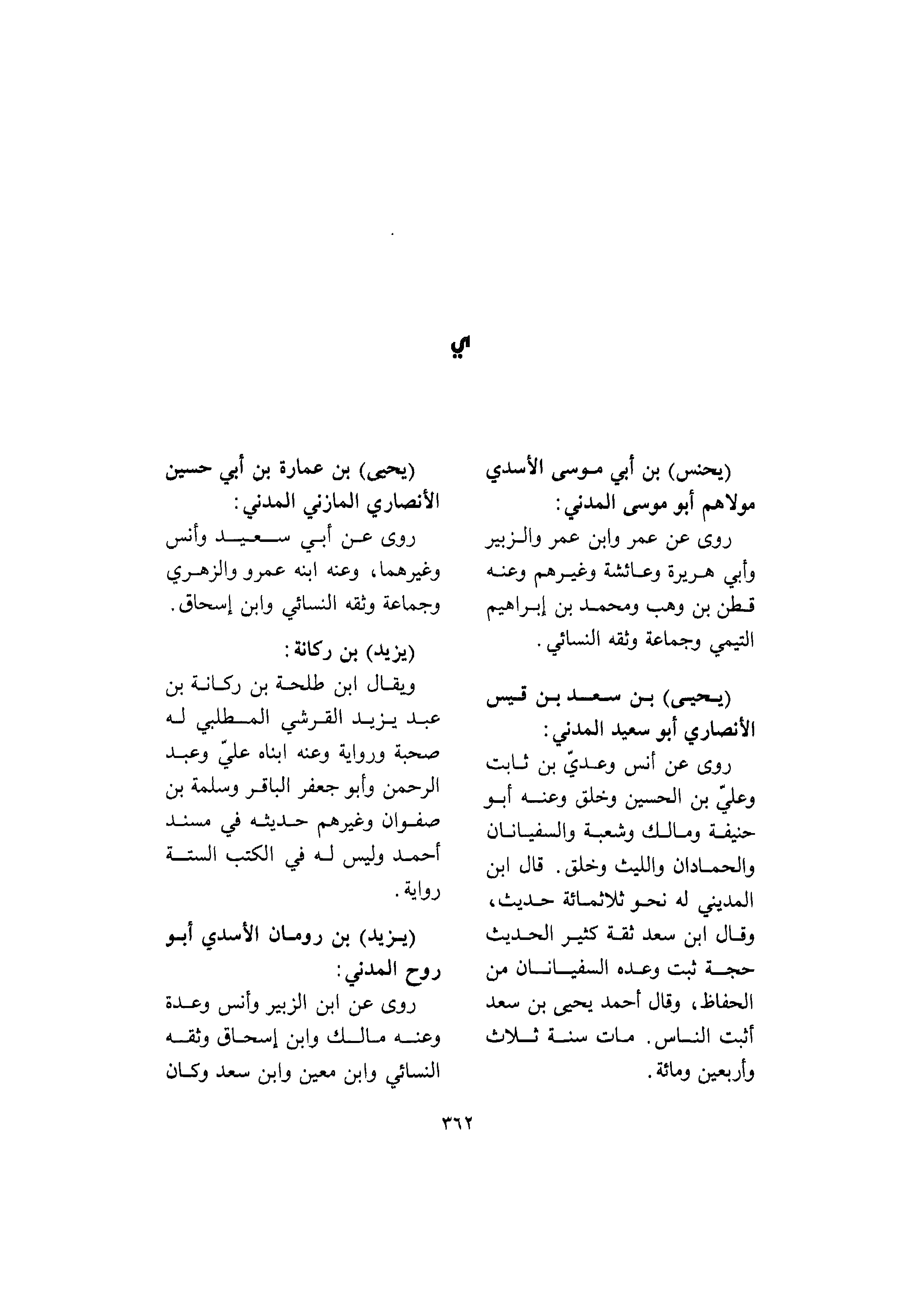 يحنس بن أبي موسى الأسدي مولاهم أبو موسى المدني روى عن عمر وابن عمر والزبير وأبي هريرة وعائشة وغيرهم وعنه قطن بن وهب ومحمد بن إبراهيم التيمي وجماعة وثقه النسائي يحيى بن سعد بن قيس الأنصاري أبو سعيد المدني قاضيها روى عن أنس وعدي بن ثابت وعلي بن الحسين وخلق وعنه أبو حنيفة ومالك وشعبة والسفيانان والحمادان والليث وخلق قال بن المديني له نحو ثلاثمائة حديث وقال بن سعد ثقة كثير الحديث حجة ثبت وعده السفيانان من الحفاظ وقال أحمد يحيى بن سعد أثبت الناس مات سنة ثلاث وأربعين ومائة يحيى بن عمارة بن أبي حسين الأنصاري المازني المدني روى عن أبي سعيد وأنس وغيرهما وعنه ابنه عمرو والزهري وجماعة وثقه النسائي وابن إسحاق يزيد بن ركانة ويقال بن طلحة بن ركانة بن عبد يزيد القرشي المطلبي له صحبة ورواية وعنه ابناه علي وعبد الرحمن وأبو جعفر الباقر وسلمة بن صفوان وغيرهم حديثه في مسند أحمد وليس له في الكتب الستة رواية يزيد بن رومان الأسدي أبو روح المدني روى عن بن الزبير وأنس وعدة وعنه مالك وابن إسحاق وثقه النسائي وابن معين وابن سعد وكان §