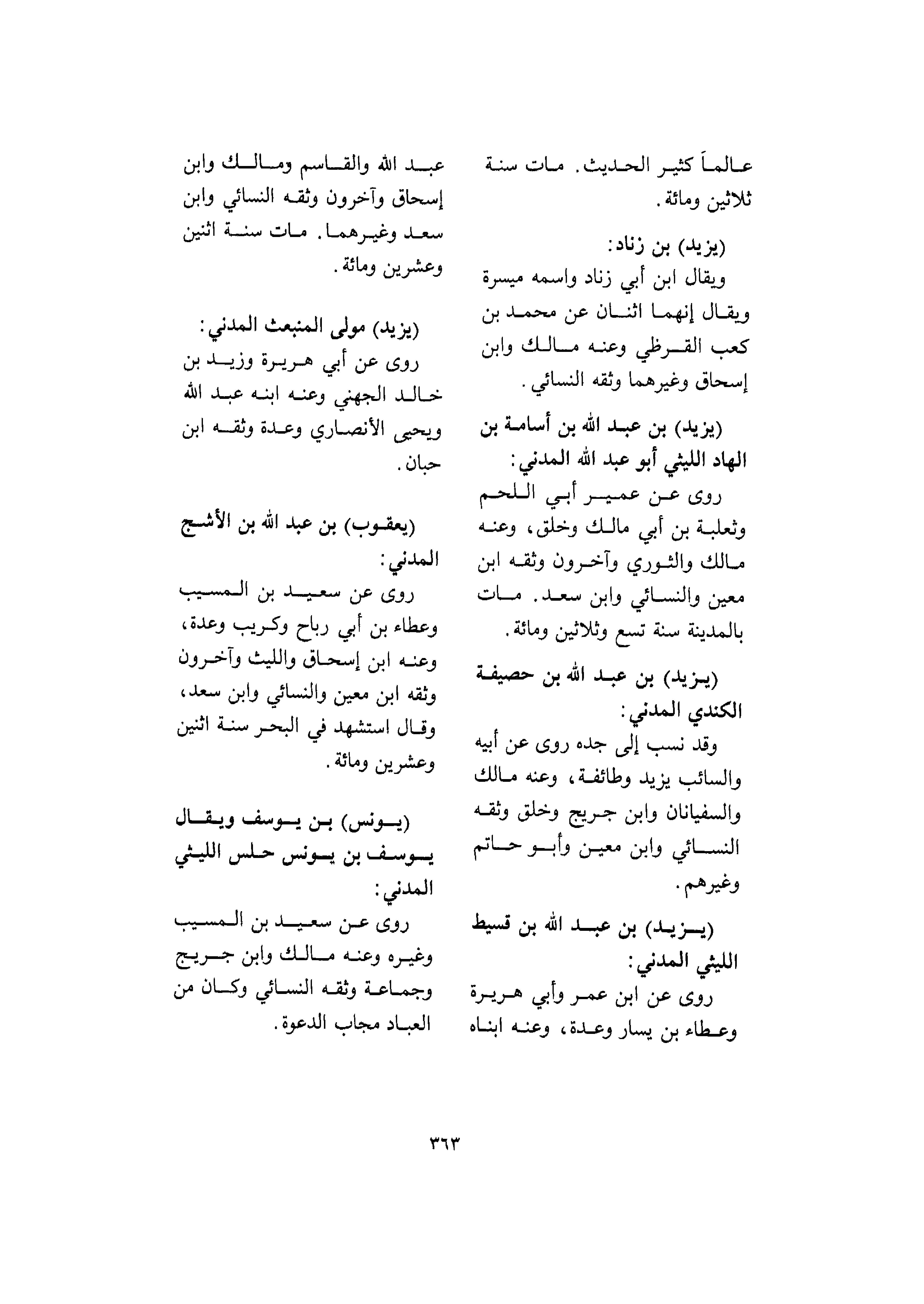 <363> عالما كثير الحديث مات سنة ثلاثين ومائة يزيد بن زناد ويقال بن أبي زناد واسمه ميسرة ويقال إنهما اثنان عن محمد بن كعب القرظي وعنه مالك وابن إسحاق وغيرهما وثقه النسائي يزيد بن عبد الله بن أسامة بن الهاد الليثي أبو عبد الله المدني روى عم عمير أبي اللحم وثعلبة بن أبي مالك وخلق وعنه مالك والثوري وآخرون وثقه بن معين والنسائي وابن سعد مات بالمدينة سنة تسع وثلاثين ومائة يزيد بن عبد الله بن حصيفة الكندي المدني وقد نسب إلى جده روى عن أبيه والسائب بن يزيد وطائفة وعنه مالك والسفيانان وابن جريج وخلق وثقه النسائي وابن معين وأبو حاتم وغيرهم يزيد بن عبد الله بن قسيط الليثي المدني روى عن بن عمر وأبي هريرة وعطاء بن يسار وعدة وعنه ابناه عبد الله والقاسم ومالك وابن إسحاق وآخرون وثقه النسائي وابن سعد وغيرهما مات سنة اثنين وعشرين ومائة يزيد مولى المنبعث مدني روى عن أبي هريرة وريد بن خالد الجهني وعنه ابنه عبد الله ويحيى الأنصاري وعدة وثقه بن حبان يعقوب بن عبد الله بن الأشج المدني عن سعيد بن المسيب وعطاء بن أبي رباح وكريب وعدة وعنه بن إسحاق والليث وآخرون وثقه بن معين والنسائي وابن سعد وقال استشهد في البحر سنة اثنين وعشرين ومائة يونس بن يوسف ويقال يوسف بن يونس حماس الليثي المدني روى عن سعيد بن المسيب وغيره وعنه مالك وابن جريج وجماعة وثقه النسائي وكان من العباد مجاب الدعوة §