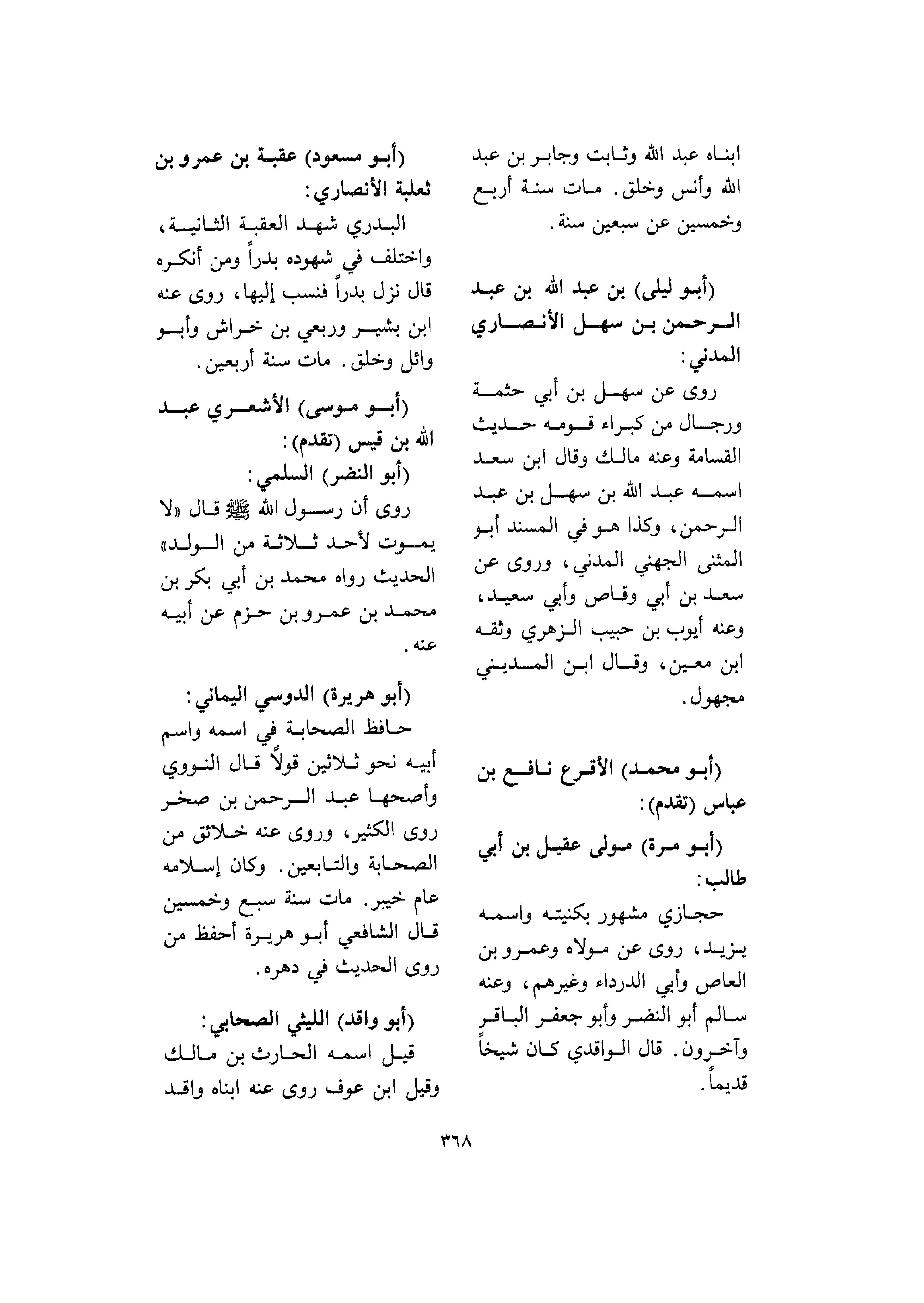 <368> ابناه عبد الله وثابت وجابر بن عبد الله وأنس وخلق مات سنة أربع وخمسين عن سبعين سنة أبو ليلى بن عبد الله بن عبد الرحمن بن سهل الأنصاري المدني روى عن سهل بن أبي حثمة ورجال من كبراء قومه حديث القسامة وعنه مالك وقال بن سعد اسمه عبد الله بن سهل بن عبد الرحمن وكذا هو في المسند أبو المثنى الجهني المدني روى عن سعد بن أبي وقاص وأبي سعيد وعنه أيوب بن حبيب الزهري وثقه بن معين وقال بن المديني مجهول أبو محمد الأقرع نافع بن عباس تقدم أبو مرة مولى عقيل بن أبي طالب حجازي مشهور بكنيته واسمه يزيد روى عن مولاه وعمرو بن العاصي وأبي الدرداء وغيرهم وعنه سالم أبو النضر وأبو جعفر الباقر وآخرون قال الواقدي كان شيخا قديما أبو مسعود عقبة بن عمرو بن ثعلبة الأنصاري البدري شهد العقبة الثانية واختلف في شهوده بدرا ومن أنكره قال نزل بدرا فنسب إليها روى عنه بن بشير وربعي بن حراش وأبو وائل وخلق مات سنة أربعين أبو موسى الأشعري عبد الله بن قيس تقدم أبو النضر سالم بن أبي أمية المدني تقدم أبو النضر السلمي روى أن رسول الله صلى الله عليه و سلم قال لا يموت لأحد ثلاثة من الولد الحديث رواه محمد بن أبي بكر بن محمد بن عمرو بن حزم عن أبيه عنه أبو هريرة الدوسي اليماني حافظ الصحابة في اسمه واسم أبيه نحو ثلاثين قولا قال النووي وأصحها عبد الرحمن بن صخر روى الكثير وروى عنه خلائق من الصحابة والتابعين وكان إسلامه عام خيبر مات سنة سبع وخمسين قال الشافعي أبو هريرة أحفظ من روى الحديث في دهره أبو واقد الليثي الصحابي قيل اسمه الحارث بن مالك وقيل بن عوف روى عنه ابناه واقد §