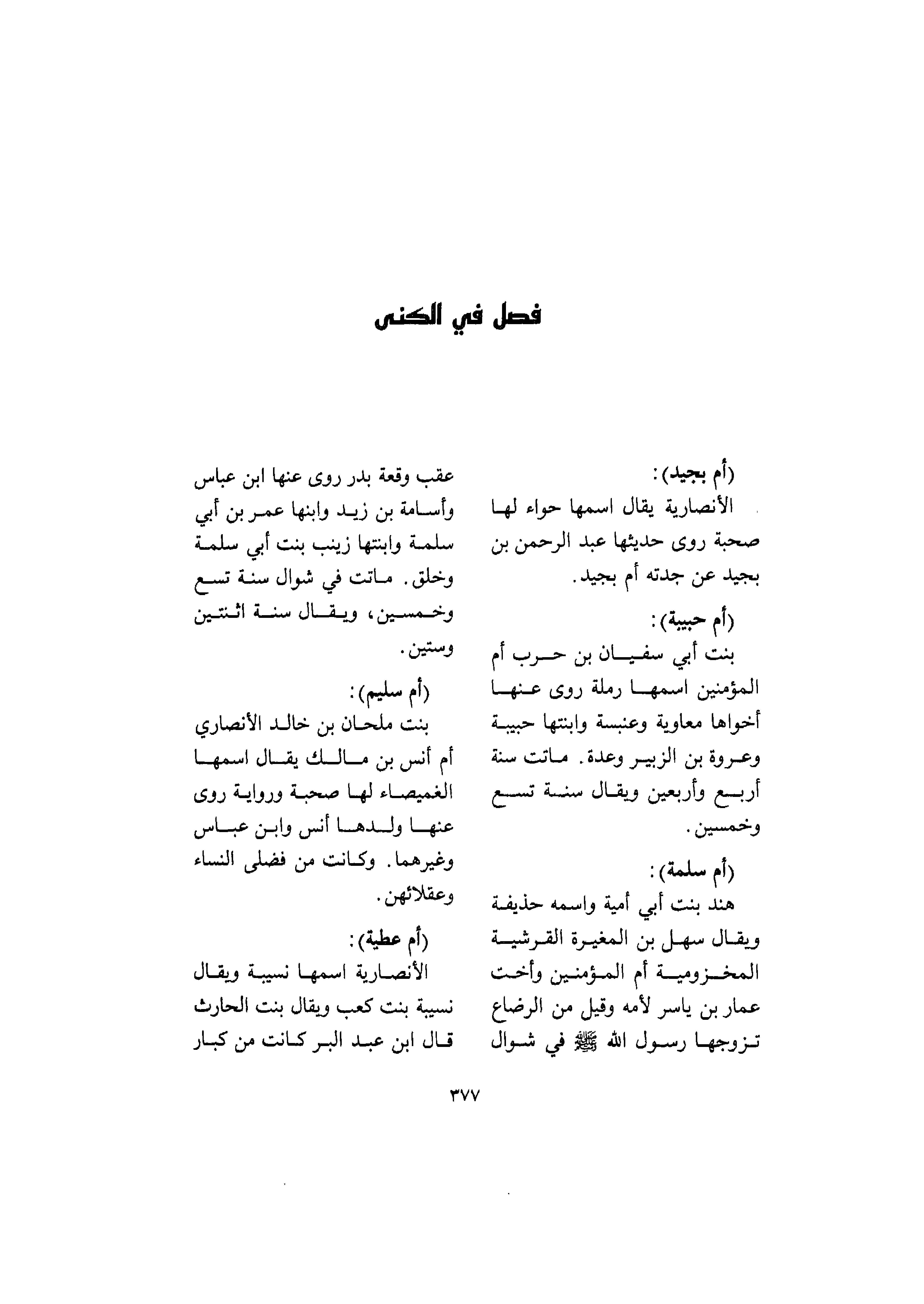 <377> فصل في الكنى أم بجيد الأنصارية يقال اسمها حواء لها صحبة روى حديثها عبد الرحمن بن بجيد عن جدته أم بجيد أم حبيبة بنت أبي سفيان بن حرب أم المؤمنين اسمها رملة روى عنها أخواها معاوية وعنبسة وابنتها حبيبة وعروة بن الزبير وعدة ماتت سنة أربع وأربعين ويقال سنة تسع وخمسين أم سلمة هند بنت أبي أمية واسمه حذيفة ويقال سهل بن المغيرة القرشية المخزومية أم المؤمنين وأخت عمار بن ياسر لأمه وقيل من الرضاع تزوجها رسول الله صلى الله عليه و سلم في شوال عقب وقعة بدر روى عنها بن عباس وأسامة بن زيد وابنها عمر بن أبي سلمة وابنتها زينب بنت أبي سلمة وخلق ماتت في شوال سنة تسع وخمسين ويقال سنة اثنتين وستين أم سليم بنت ملحان بن خالد الأنصاري أم أنس بن مالك يقال اسمها الغميصاء لها صحبة ورواية روى عنها ولدها أنس وابن عباس وغيرهما وكانت من فضلى النساء وعقلائهن أم عطية الأنصارية اسمها نسيبة ويقال نسيبة بنت كعب ويقال بنت الحارث قال بن عبد البر كانت من كبار §