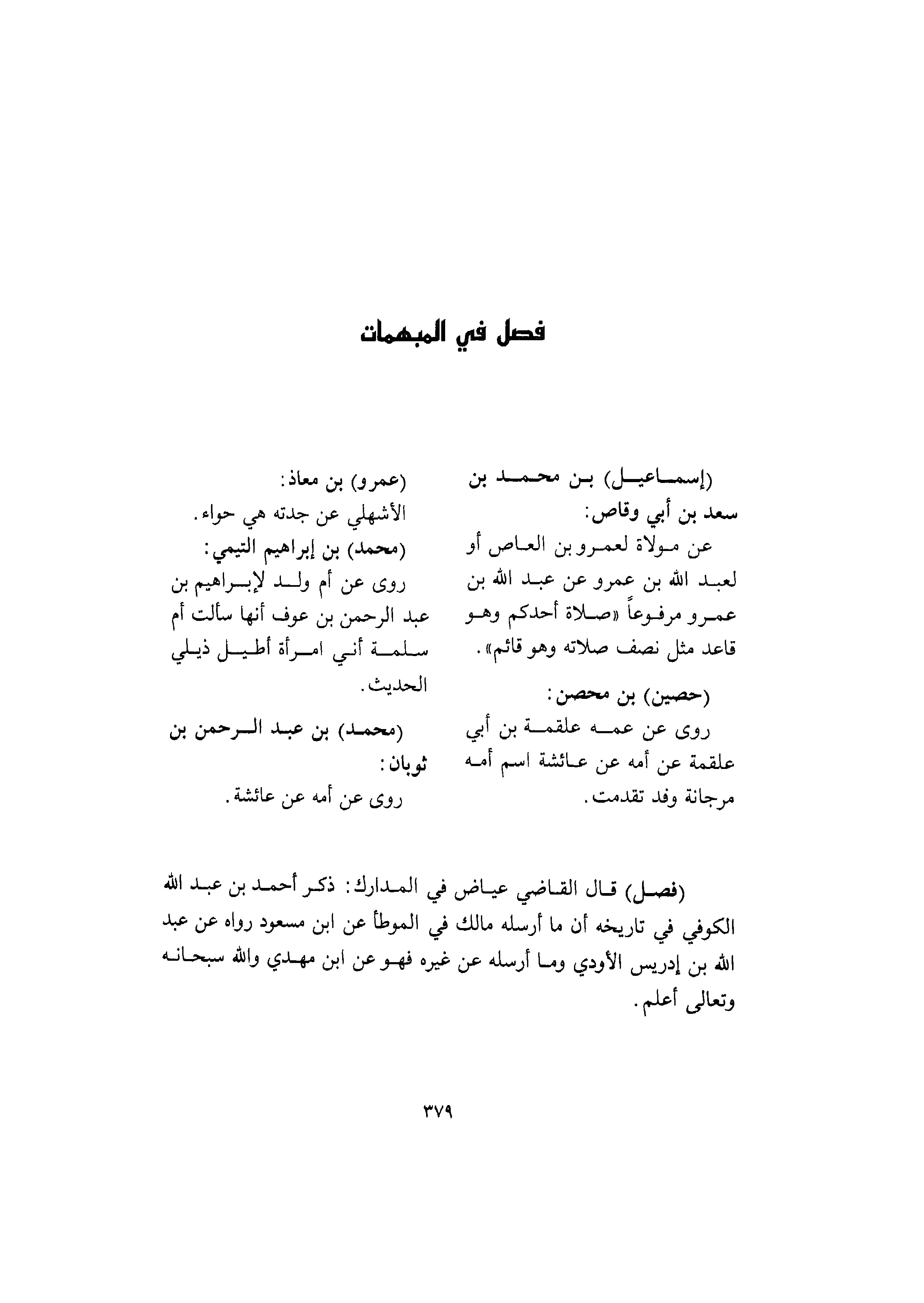 <379> فصل في المبهمات إسماعيل بن محمد بن سعد بن أبي وقاص عن مولاه لعمرو بن العاص أو لعبد الله بن عمرو عن عبد الله بن عمرو مرفوعا صلاة أحدكم وهو قاعد مثل نصف صلاته وهو قائم حصين بن محصن روى عن عمه علقمة بن أبي علقمة عن أمه عن عائشة اسم أمه مرجانة وقد تقدمت عمرو بن معاذ الأشهلي عن جدته هي حواء محمد بن إبراهيم التيمي روى عن أم ولد لإبراهيم بن عبد الرحمن بن عوف أنها سألت أم سلمة إني امرأة أطيل ذيلي الحديث محمد بن عبد الرحمن بن ثوبان روى عن أمه عن عائشة فصل قال القاضي عياض في المدارك ذكر أحمد بن عبد الله الكوفي في تاريخه أن ما أرسله مالك في الموطأ عن بن مسعود رواه عن عبد الله بن إدريس الأودي وما أرسله عن غيره فهو عن بن مهدي والله سبحانه وتعالى أعلم