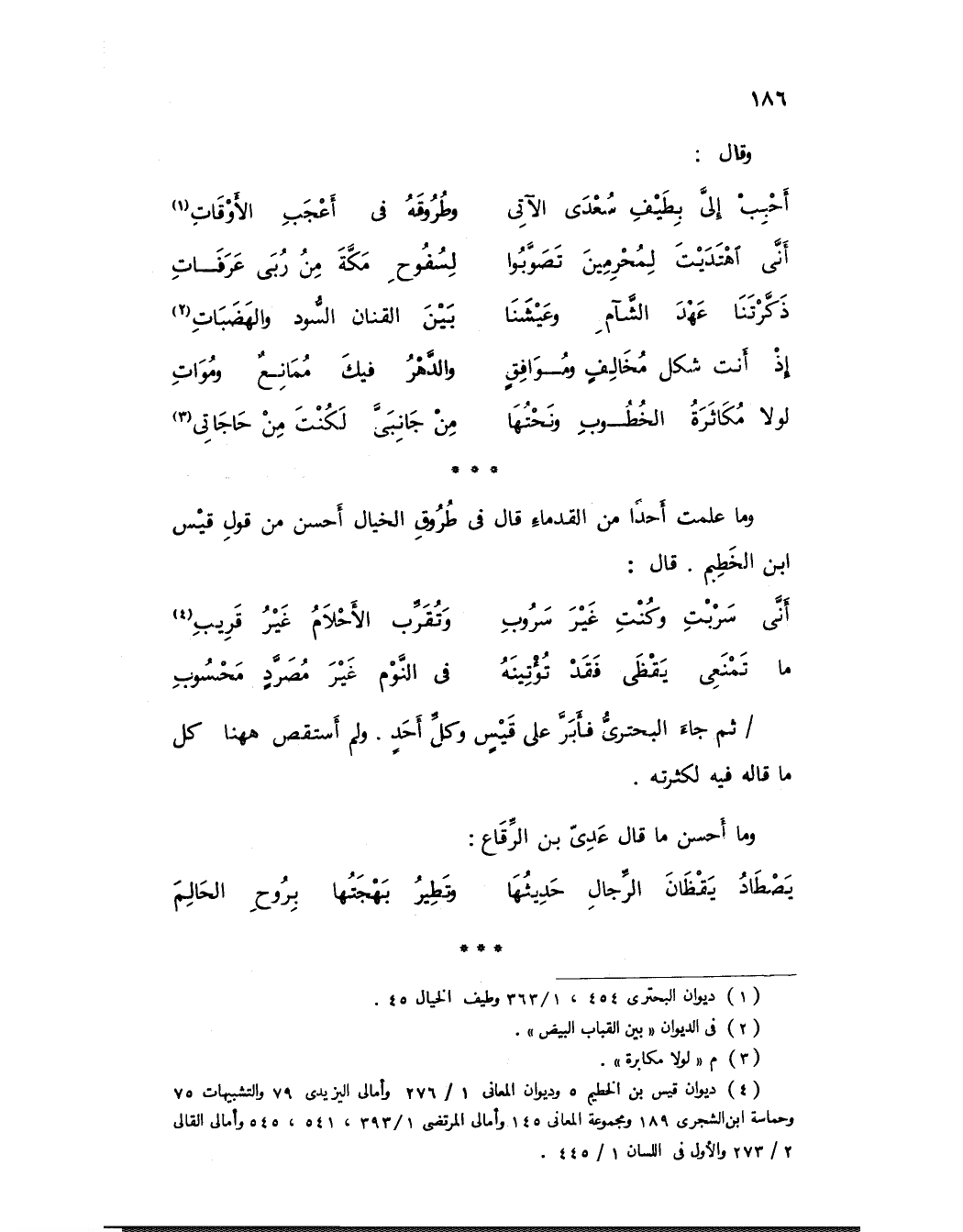 وما علمت أحداً من القدماء قال في طروق الخيال أحسن من قول قيس بن الخطيم، قال:
