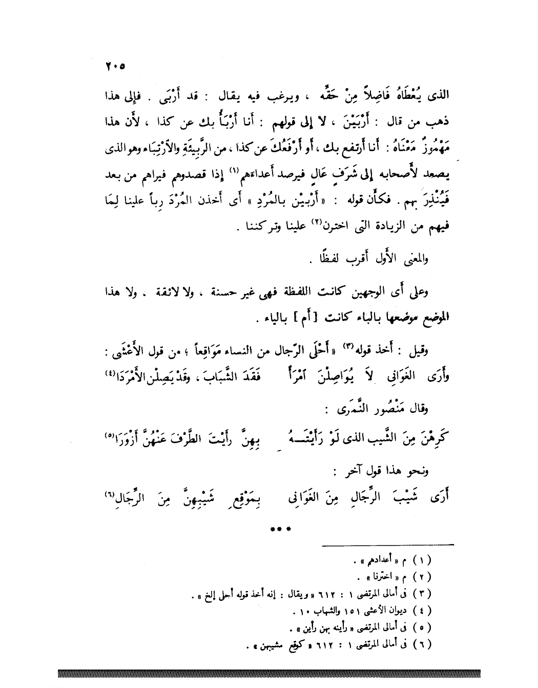 الذي يعطاه فاضلاً من حقه، ويرغب يقال: قد أربى، فإلى هذا ذهب من قال: أربين، لا إلى قولهم: أنا أربأ بك عن كذا، لأن هذا مهموز معناه: أنا أرتفع بك، أو أرفعك عن كذا، من الربيئة والارتباء وهو الذي يصعد لأصحابه إلى شرف عال فيرصد أعداءهم (1) إذا قصدوهم فيراهم من بعد فينذرهم بهم، فكأنه قوله: «أربين بالمرد» أي أخذن المرد رباً علينا لما فيهم من الزيادة التي اخترن (2) علينا وتركننا.