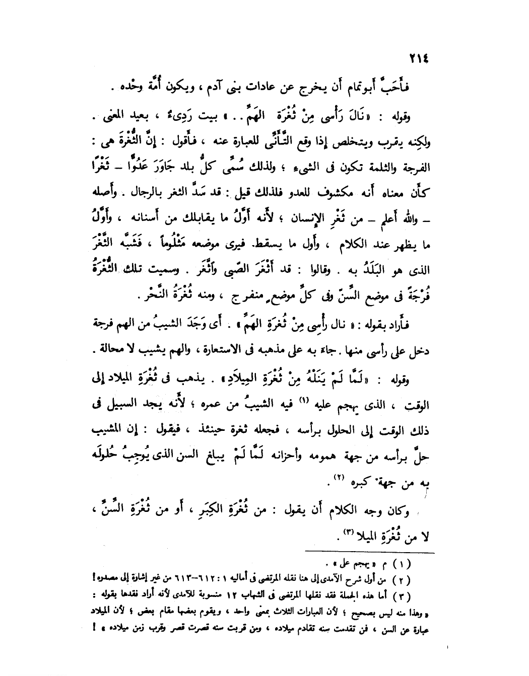 وقوله: «لما لم ينله من ثغرة الميلاد»، يذهب في ثغرة الميلاد إلى الوقت الذي يهجم عليه (1) فيه الشيب من عمره؛ لأنه يجد السبيل في ذلك الوقت إلى الحلول برأسه، فجعله ثغرة حينئذ، فيقول: إن المشيب حل برأسه من جهة همومه وأحزانه لما لم يبلغ السن الذي يوجب حلوله به من جهة كبره (2).