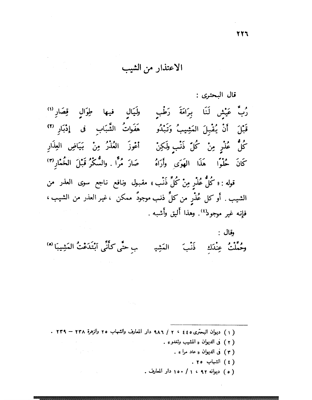 قوله: «كل عذر من كل ذنب» مقبول ونافع ناجع سوى العذر من الشيب، أو كل عذر من كل ذنب موجود ممكن، غير العذر من الشيب، فإنه غير موجود (4) وهذا أليق وأشبه.