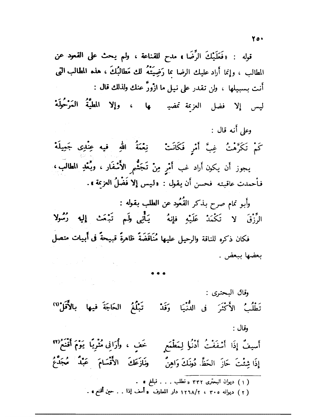 قوله: «فعليك الرضا» مدح للقناعة، ولم يحث على القعود عن المطالب، وإنما أراد عليك الرضا بما رضيته لك مطالبك، هذه الماطالب التي أنت بسبيلها، ولن تقدر على نيل ما ازور عنك ولذلك قال: