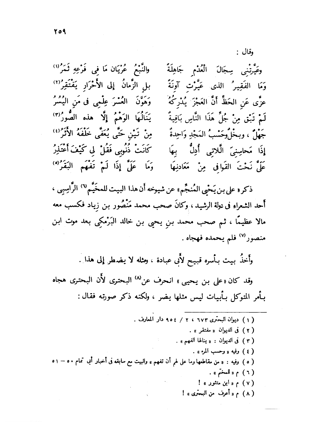 وقد كان علي بن يحيى انحرف عن (8) البحتري لأن البحتري هجاه بأمر المتوكل بأبيات ليس مثلها يضر، ولكنه ذكر صورته فقال: