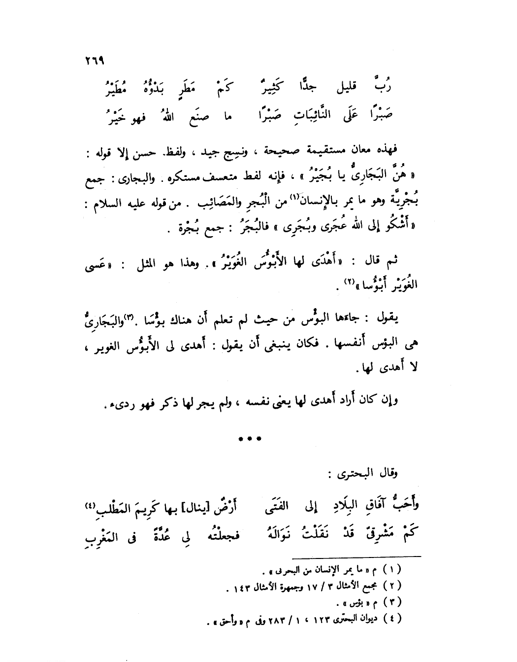 فهذه معان مستقيمة صحيحة، ونسج جيد، ولفظ حسن إلا قوله: «هن البجاري يا بجير»، فإنه لفظ متعسف مستكره، والبجاري: جمع بجرية وهو ما يمر بالإنسان (1) من البجر والمصائب، من قوله عليه السلام: «أشكو إلى الله عجري وبجري» فالبجر: جمع بجرة.