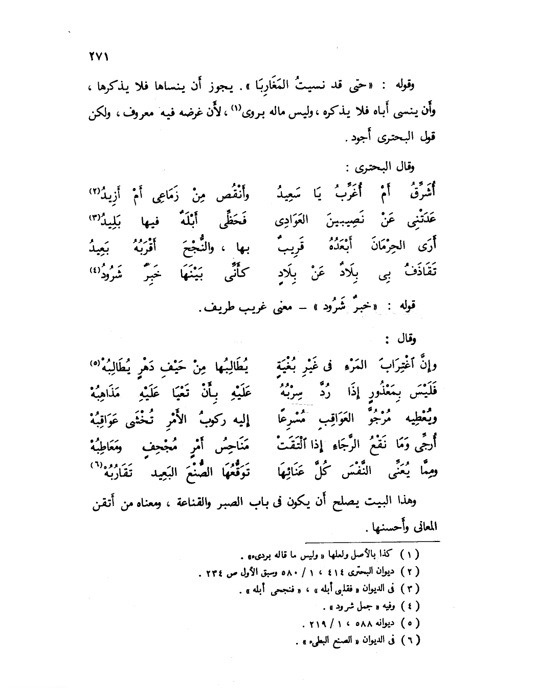 وقوله: «حتى نسيت المغاربا»، يجوز أن ينساها فلا يذكرها، وأن ينسى أباه فلا يذكره، وليس ماله بروي (1)، لأن غرضه فيه معروف، ولكن قول البحتري أجود.