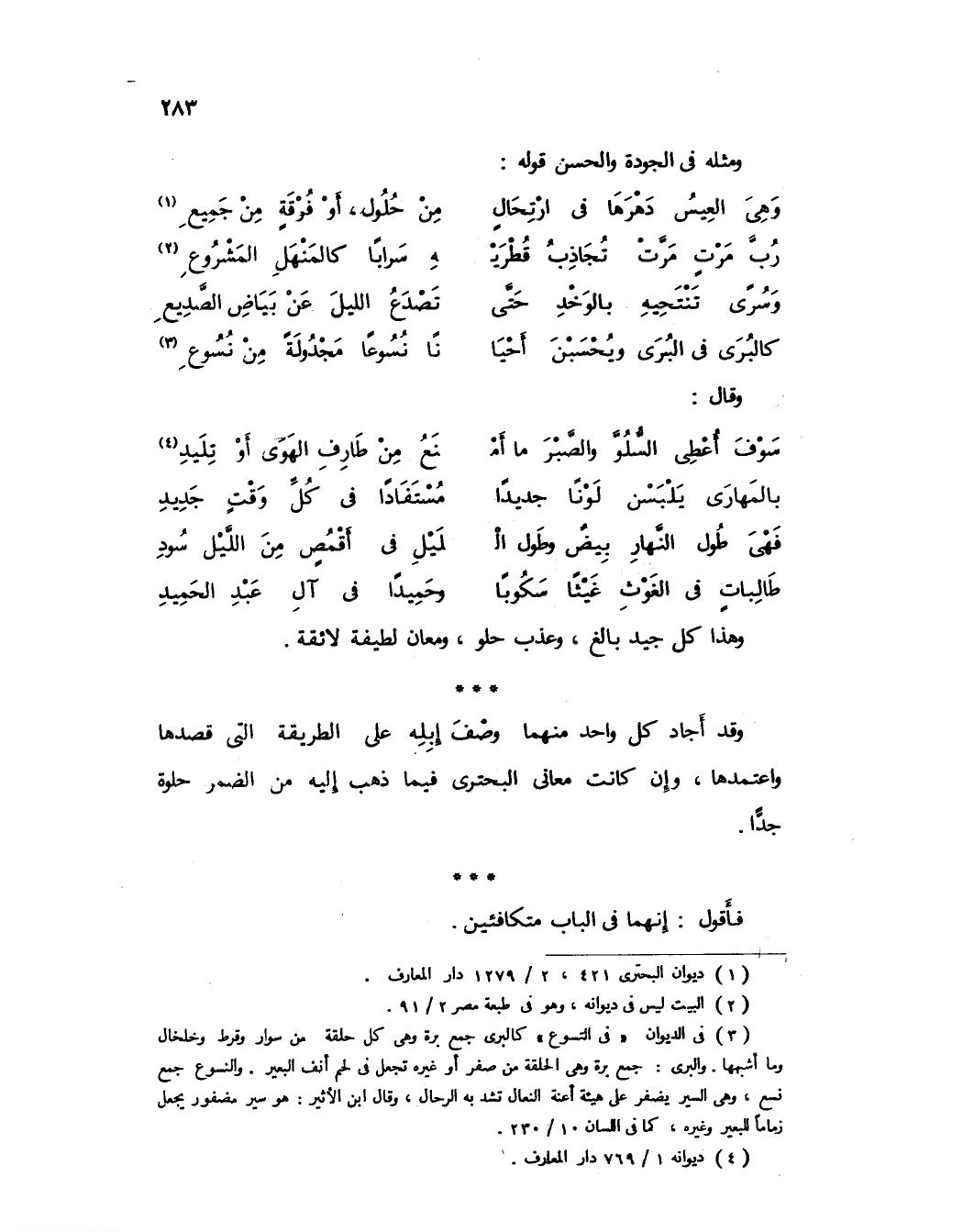 ... وقد أجاد كل واحد منهما وصف إبله على الطريقة التي قصدها واعتمدها، وإن كانت معاني البحتري فيما ذهب إليه من الضمر حلوة جداً.