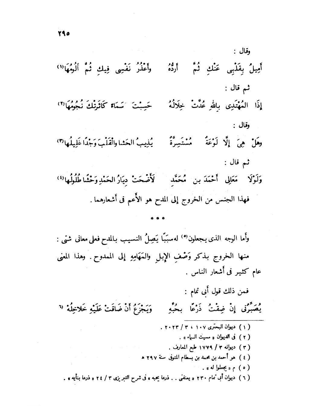 ... وأما الوجه الذي يجعلون (5) له سبباً يصل النسيب بالمدح فعلى معاني شتى: منها الخروج بذكر وصف الإبل والمهامه إلى الممدوح، وهذا المعنى عام كثير في أشعار الناس.