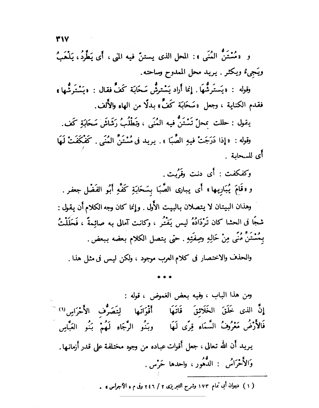 وهذان البيتان لا يتصلان بالبيت الأول، وإنما كان وجه الكلام أن يقول: شجاً في الحشا كان ترداده ليس يفتر، وكانت آمالي به صائمة، فحللت بمستن منى من حاله وصفته، حتى يتصل الكلام بعضه ببعض.