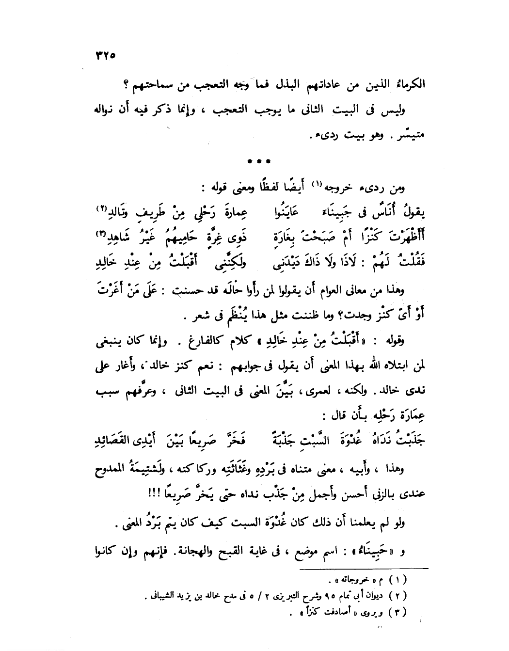 وقوله: «أقبلت من عند خالد» كلام الفارغ، وإنما كان ينبغي لمن ابتلاه الله بهذا المعنى أن يقول في جوابهم: نعم كنز خالد، وأغار على ندى خالد، ولكنه -لعمري- بين المعنى في البيت الثاني، وعرفهم سبب عمارة رحله بأن قال: