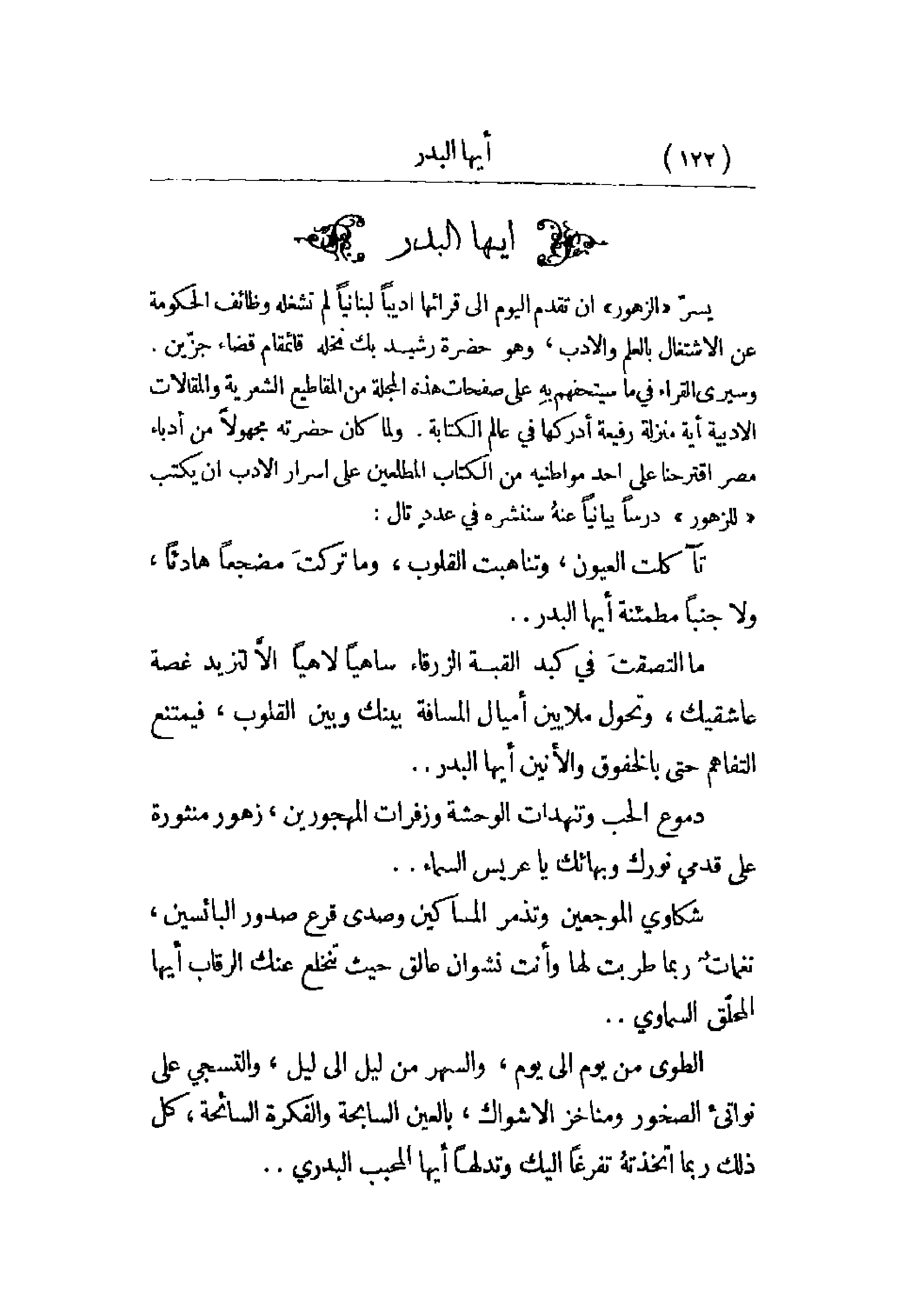 ما التصقت في كبد القبة الزرقاء ساهياً لاهياً إلا لتزيد غصة عاشقيك، وتحول ملايين أميال المسافة بينك وبين القلوب، فيمتنع التفاهم حتى بالخفوق والأنين أيها البدر. .