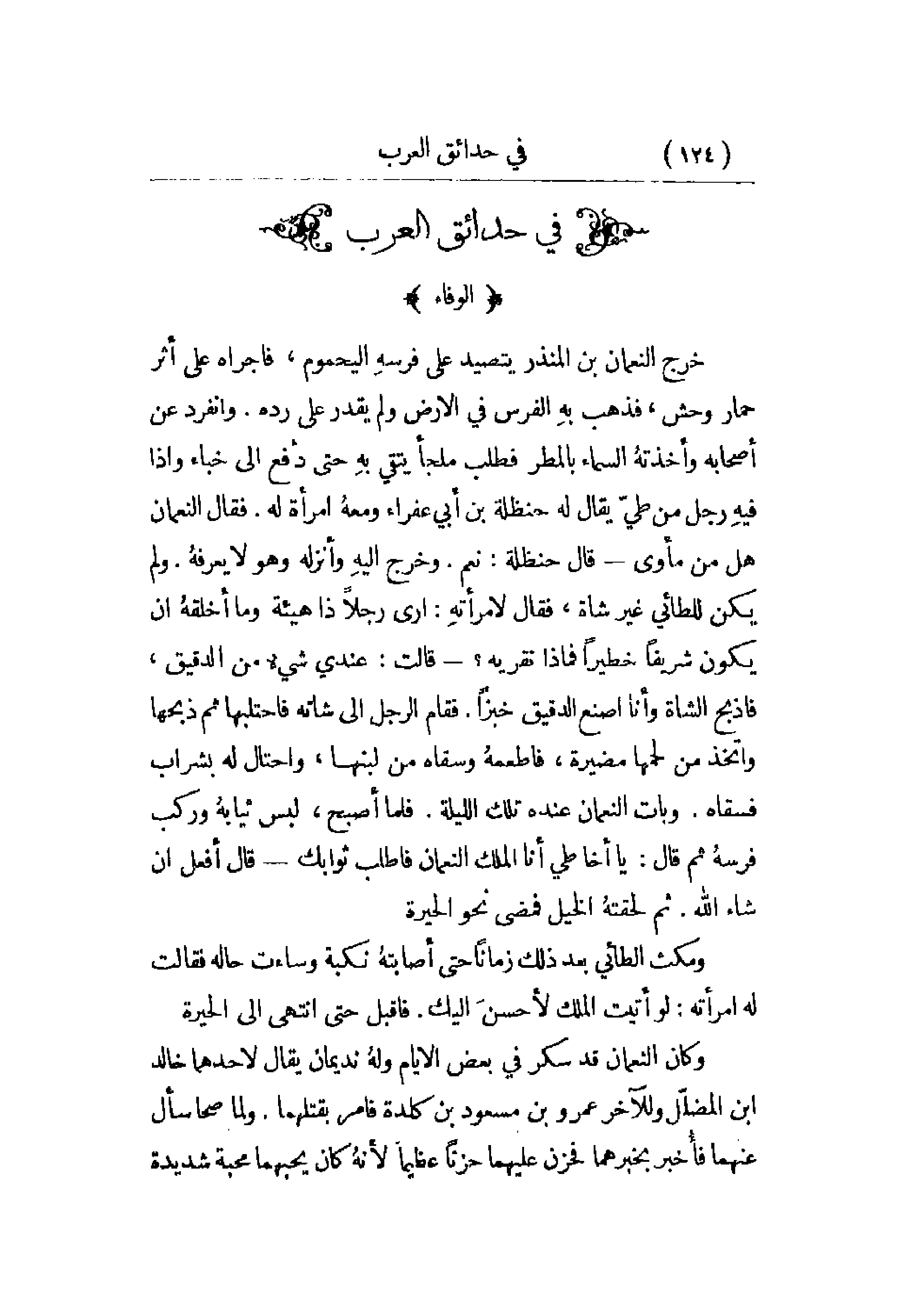 خرج النعمان بن المنذر يتصد على فرسه اليحموم، فأجراه على أثر حمار وحش، فذهب به الفرس في الأرض ولم يقدر على رده. وانفرد عن أصحابه وأخذته السماء بالمطر. فطلب ملجأ يتقي به حتى دفع إلى خباء وإذا فيه رجل من طيّ يقال له حنظلة بن أبي عفراء ومعه امرأة له. فقال النعمان هل من مأوى - قال حنظلة: نعم. وخرج إليه وأنزله وهو لا يعرفه. ولم يكن للطائي غير شاة، فقال لامرأته: أرى رجلاً ذا هيئة وما أخلقهُ أن يكون شريفاً خطيراً فماذا نقريه؟ - قالت: عندي شيءٌّ من الدقيق، فاذبح الشاة وأنا أصنع الدقيق خبزاً. فقال الرجل إلى شاته فاحتلبها ثم ذبحها واتخذ من لحمها مضيرة، فأطعمه وسقاه من لبنها، واحتال له بشراب فسقاه. وبات النعمان عنده تلك الليلة. فلما أصبح، لبس ثيابه وركب فرسه ثم قال: يا أخا طي أنا الملك النعمان فاطلب ثوابك - قال أفعل أن شاء الله. ثم لحقته الخيل فمضى نحو الحيرة.