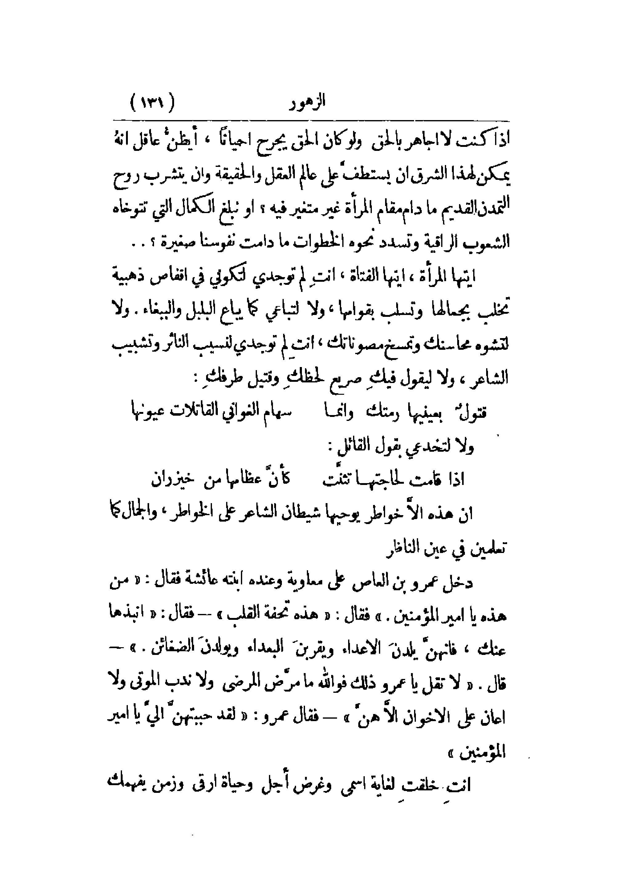 أيتها المرأة، أيتها الفتاة، أنتِ لم توجدي لتكوني في أقفاص ذهبية تخلب بجمالها وتسلب بقوامها، ولا لتباهي كما يباع البلبل والببغاء. ولا لتشوه محاسنك وتمسخ مصوناتك، أنتش لم توجدي لنسيب الناثر وتشبيب الشاعر، ولا ليقول فيك صريع لحظكِ وقتيل طرفكِ: