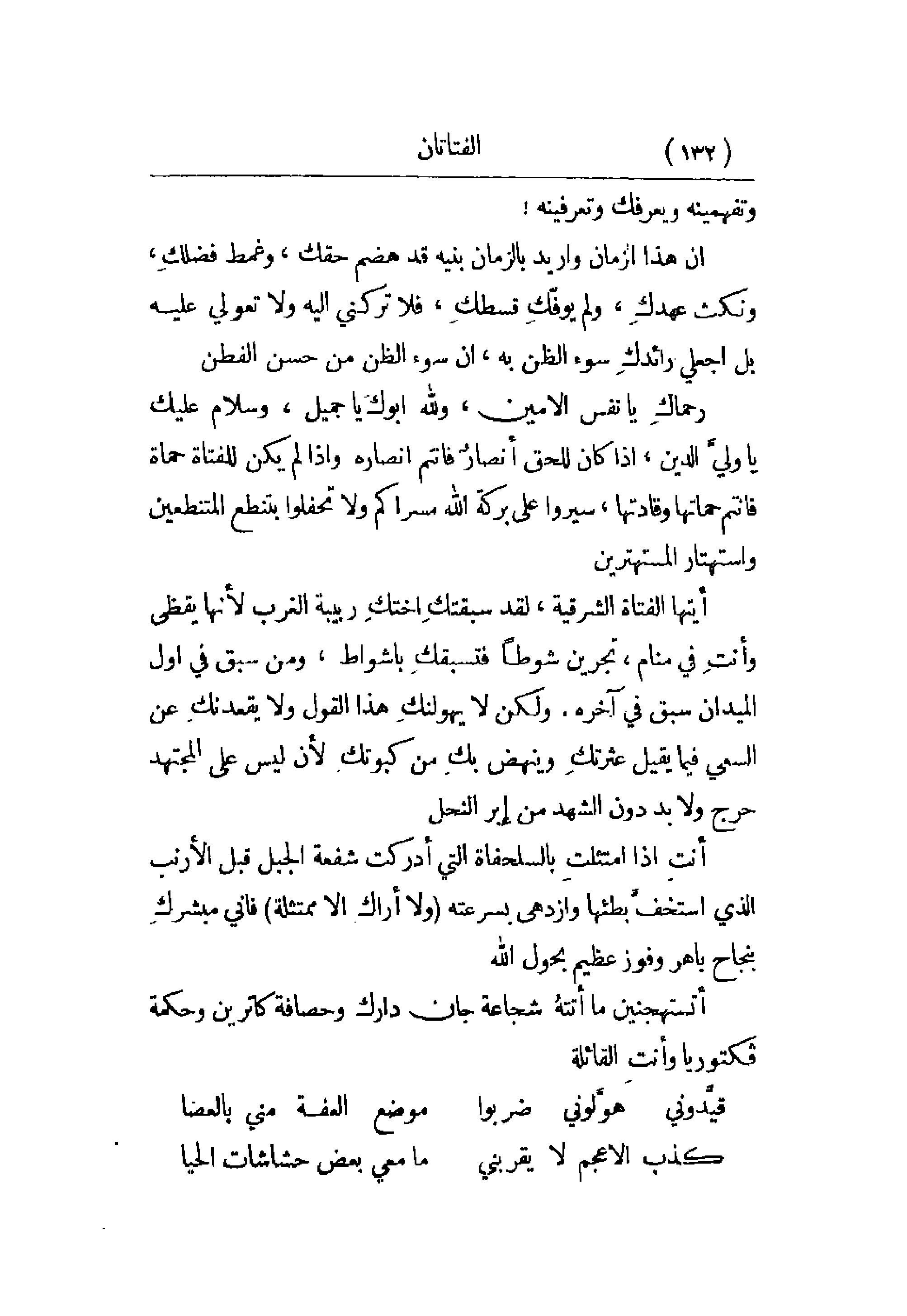 رحماكِ يا نفس الأمين، ولله أبوكَ يا جميل، وسلام عليم يا وليَّ الدين، إذا كان للحق أنصار فأنتم أنصاره وإذا لم يكن للفتاة حماة فانتم حماتها وقادتها، سيروا على بركة الله مسراكم ولا تحفلوا بتنطع المتنطعين واستهتار المستهترين.