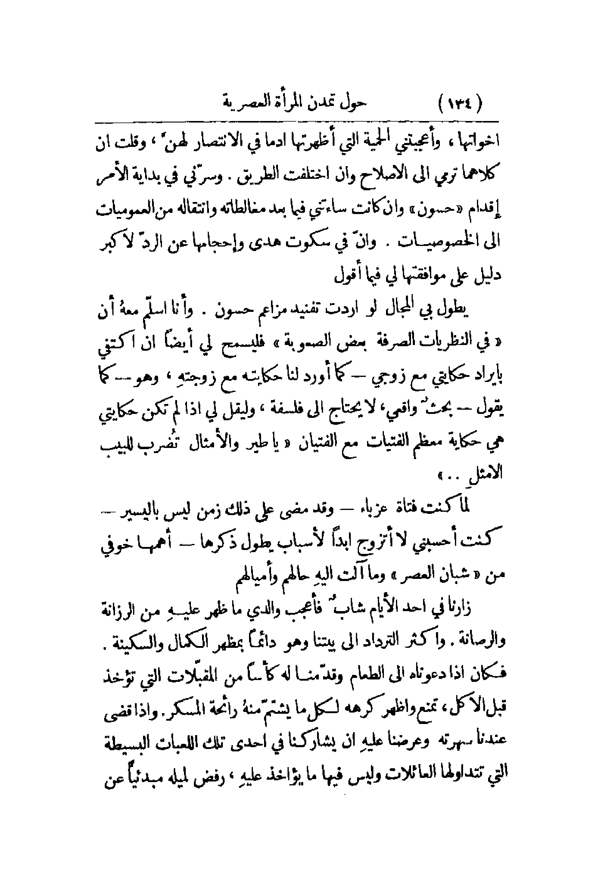 يطول بي المجال لو أردت تفنيد مزاعم حسون. وأنا أسلّم معهُ أن في النظريات الصرفة بعض الصعوبة فليسمح لي أيضاً أن أكتفي بإيراد حكايتي مع زوجي - كما أورد لنا حكايته مع زوجته، وهو - كما يقول - بحثٌ واقعي، لا يحتاج إلى فلسفة، وليقل لي إذا لم تكن حكايتي هي حكاية معظم الفتيات مع الفتيان يا طير والأمثال تُضرب للبيب الأمثلِ. . . .