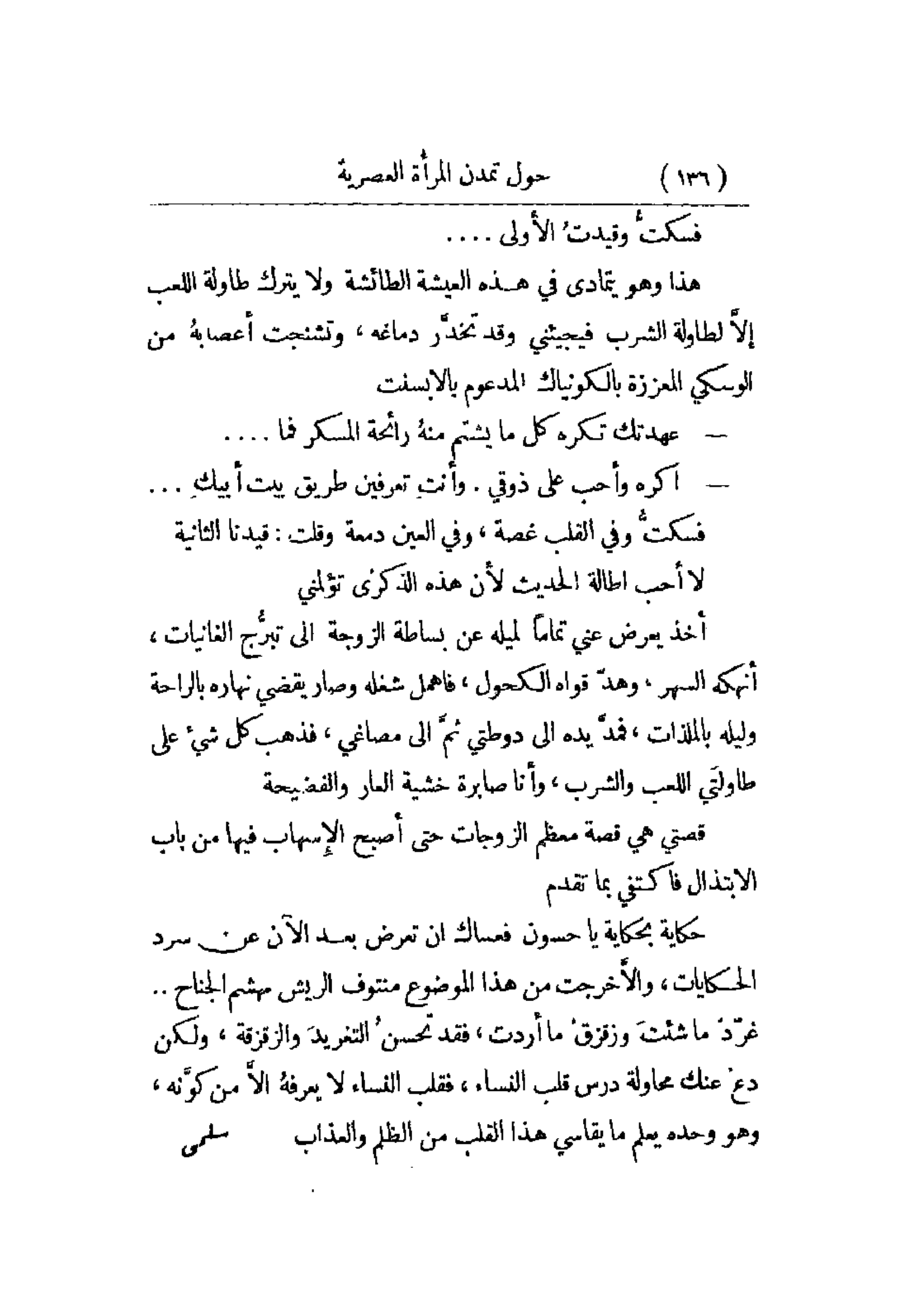 أخذ يعرض عني تماماً لميه عن بساطة الزوجة إلى تبرُّج الغانيات، أنهكه السهر، وهدّ قواه الكحول، فأهمل شغله وصار يقضي نهاره بالراحة وليله بالملذات، فمدّ يده إلى دوطتي ثم إلى مصاغي، فذهب كل شيء على طاولتي اللعب والشرب، وأنا صابرة خشية العار والفضيحة.