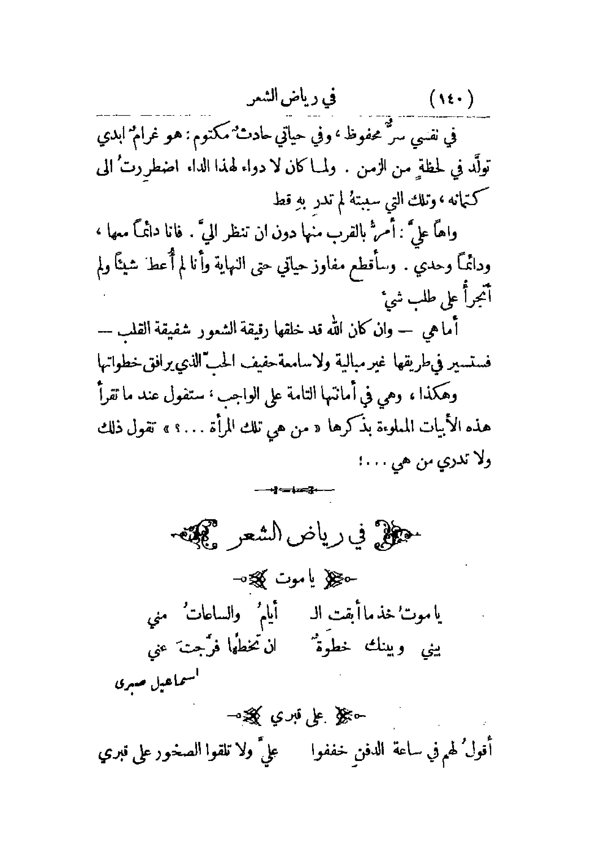 في نفسي سرٌّ محفوظ، وفي حياتي حادثٌ مكتوم: هو غرامٌ أبدي تولّد في لحظةٍ من الزمن. ولما كان لا دواء لهذا الداء اضطررت إلى كتمانه، وتلك التي سببته لم تدر به قط.