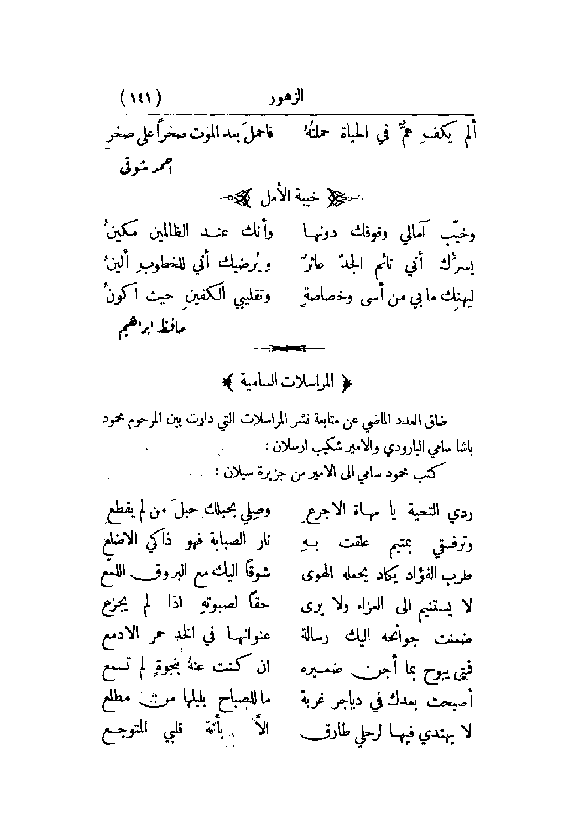 ضاق العدد الماضي عن متابعة نشر المراسلات التي دارت بين المرحوم محمود باشا سامي البارودي والأمير شكيب أرسلان: