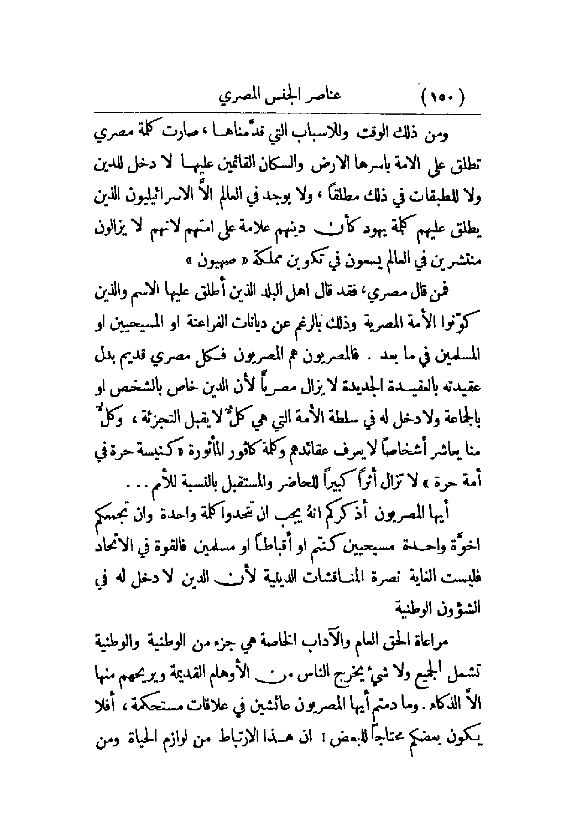 مراعاة الحق العام والآداب الخاصة هي جزء من الوطنية والوطنية تشمل الجميع ولا شيء يخرج الناس من الأوهام القديمة ويريحهم منها إلا الذكاء. وما دمتم أيها المصريون عائشين في علاقات مستحكمة، أفلا يكون بعضكم محتاجاً للبعض! إن هذا الارتباط من لوازم الحياة ومن