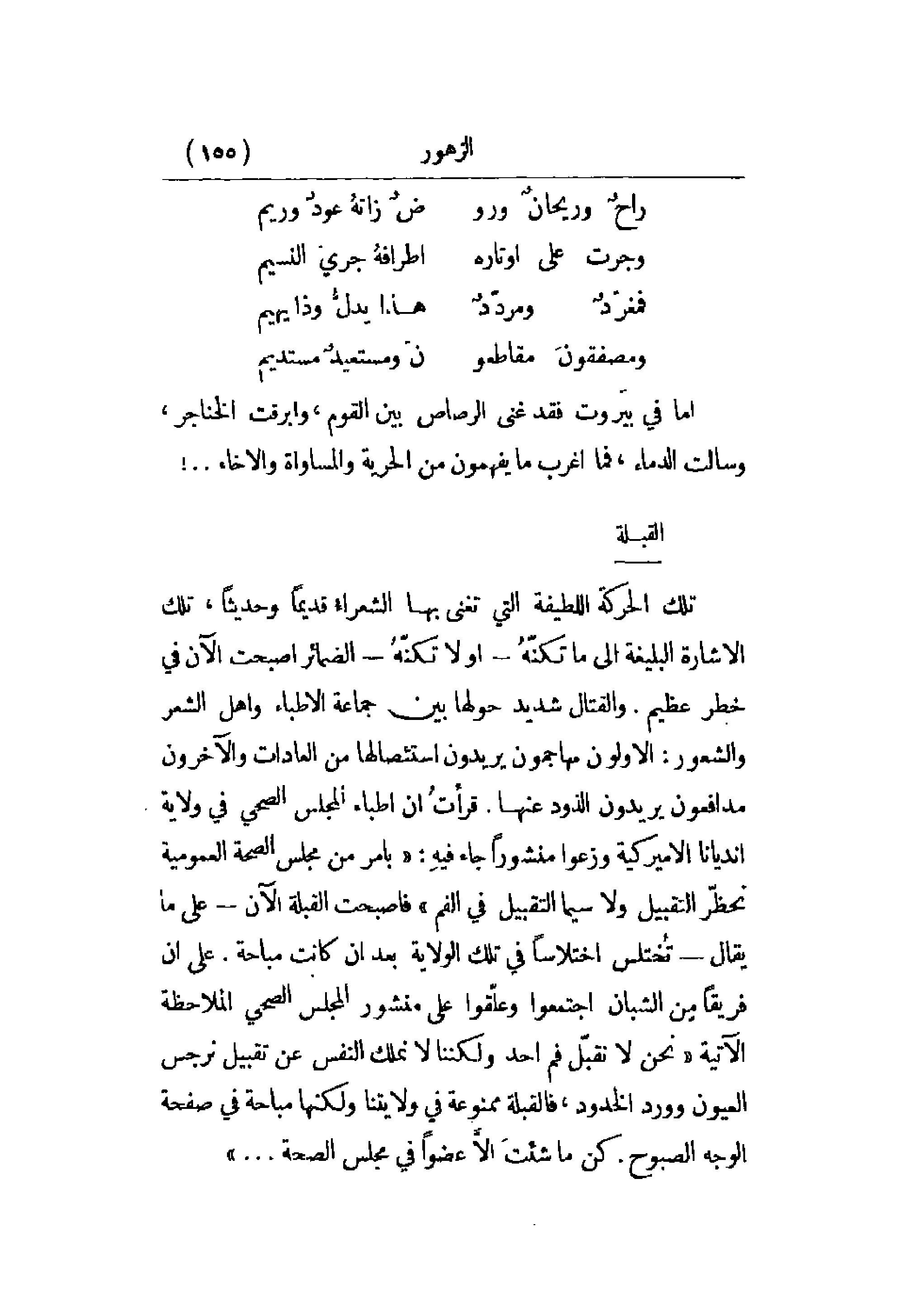 الملاحظة الآتية نحن لا تقبل فم أحد ولكننا لا نملك النفس عن تقبيل نرجس العيون وورد الخدود، فالقبلة ممنوعة في ولايتنا ولكنها مباحة في صفحة الوجه الصبوح. كن ما شئت إلا عضواً في مجلس الصحة. . . .