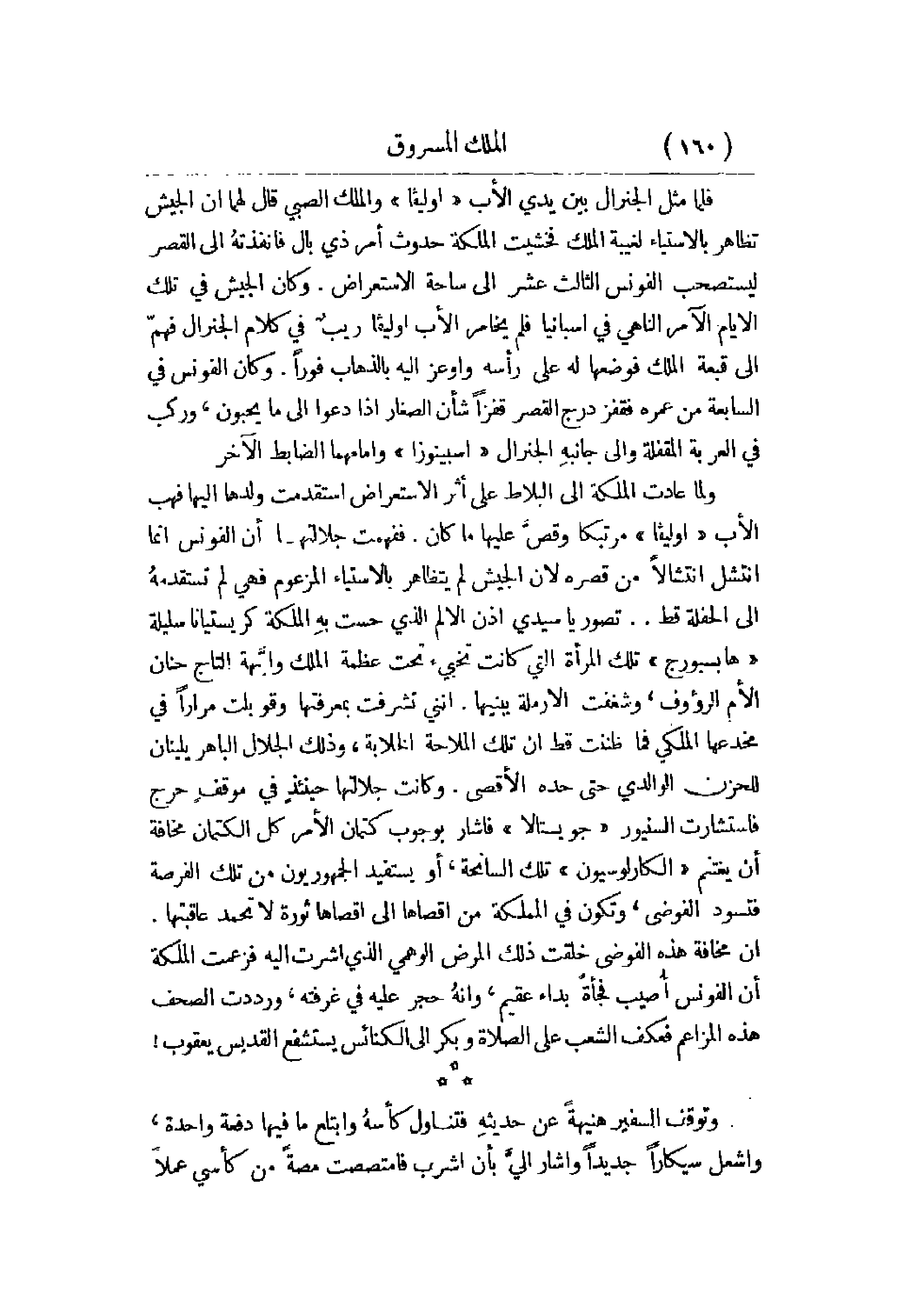 عظمة الملك وأبهة التاج حنان الأم الرؤوف، وشغفت الأرملة ببنيها. إنني تشرفت بمعرفتها وقوبلت مراراً في مخدعها الملكي فما ظننت قط أن تلك الملاحة الخلابة، وذلك الجلال الباهر يلينان للحزن الوالدي حتى حده الأقصى. وكانت جلالتها حينئذ في موقفٍ حرج فاستشارت السنيور جويستالا فأشار بوجوب كتمان الأمر كل الكتمان مخافةً أن يغتنم الكارلوسيون تلك السانحة، أو يستفيد الجمهوريون من تلك الفرصة فتسود الفوضى، وتكون في المملكة من أقصاها إلى أقصاها ثورة لا تحمد عاقبتها. إن مخافة هذه الفوضى خلقت ذلك المرض الوهمي الذي أشرت إليه فزعمت الملكة أن ألفونس أصيب فجأة بداء عقيم، وإنه حجر عليه في غرفته، ورددت الصحف هذه المزاعم فعكف الشعب على الصلاة وبكر إلى الكنائس يتشفع القديس يعقوب!