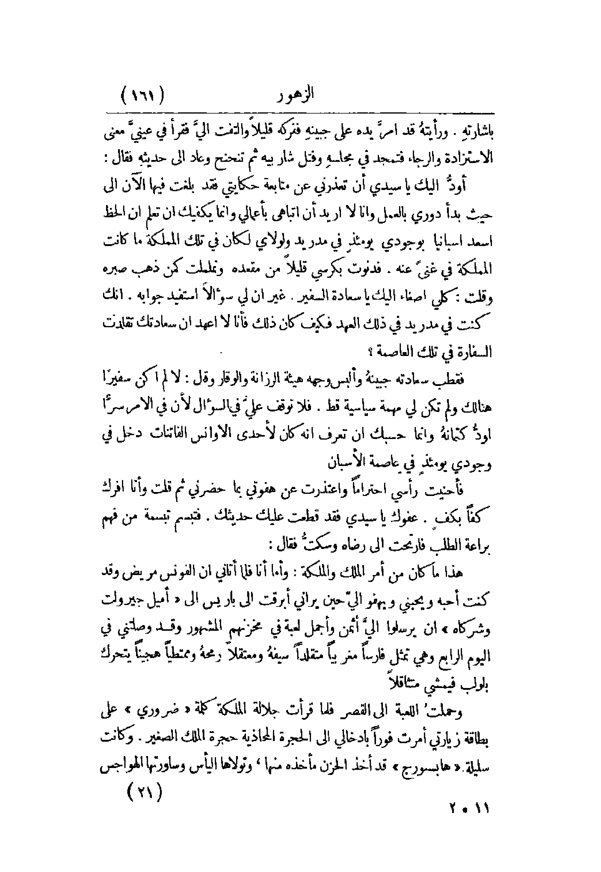 أود إليك يا سيدي أن تعذرني عن متابعة حكايتي فقد بلغت فيها الآن حيث بدأ دوري بالعمل وأنا لا أريد أن أتباهى بأعمالي وإنما يكفيك أن تعلم أن الحظ أسعد إسبانيا بوجودي يومئذ في مدريد ولولاي لكان في تلك المملكة ما كانت المملكة في غنىً عنه. فدنوت بكرسي قليلاً من مقعده وتململت كمن ذهب صبره وقلت: كلي إصغاء إليك يا سعادة السفير. غير أن لي سؤالاً أستفيد جوابه. إنك كنت في مدريد في ذلك العهد فكيف كان ذلك فأنا لا أعهد أن سعادتك تقلدت السفارة في تلك العاصمة؟