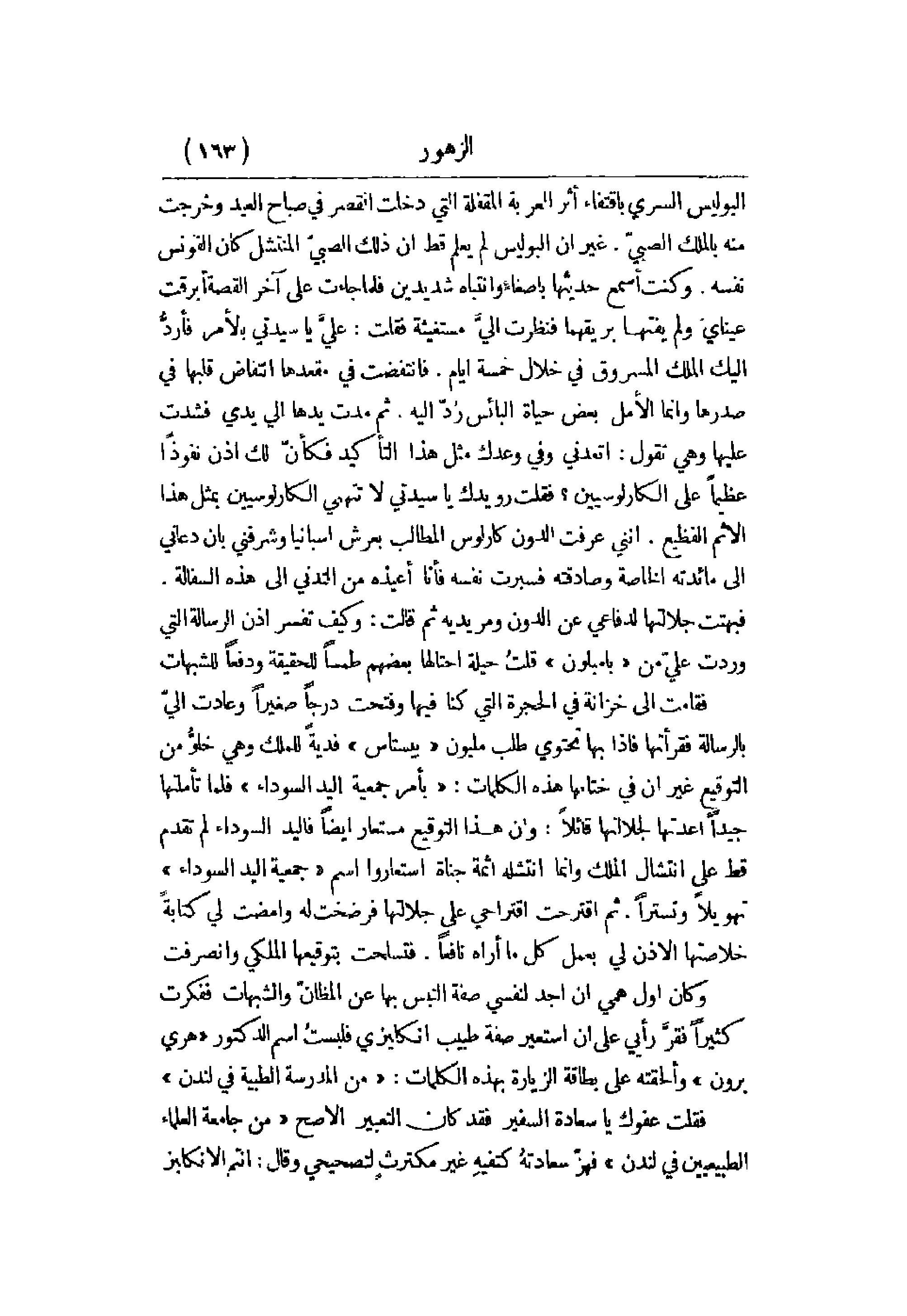 فقامت إلى خزانة في الحجرة التي كنا فيها وفتحت درجاً صغيراً وعادت إلي بالرسالة فقرأتها فإذا بها تحتوي طلب مليون بيستاس فديةً للملك وهي خلو من التوقيع غير أن في ختامها هذه الكلمات: بأمر جمعية اليد السوداء فلما تأملتها جيداً أعدتها لجلالتها قائلاً: وإن هذا التوقيع مستعارً أيضاً فاليد السوداء لم تقدم قط على انتشال الملك وإنما انتشله أثمة جناة استعاروا اسم جمعية اليد السوداء تهويلاً وتستراً. ثم اقترحت اقتراحي على جلالتها فرضخت له وأمضت لي كتابةً خلاصتها الإذن لي بعمل كل ما أراه نافعاً. فتسلحت بتوقيعها الملكي وانصرفت.