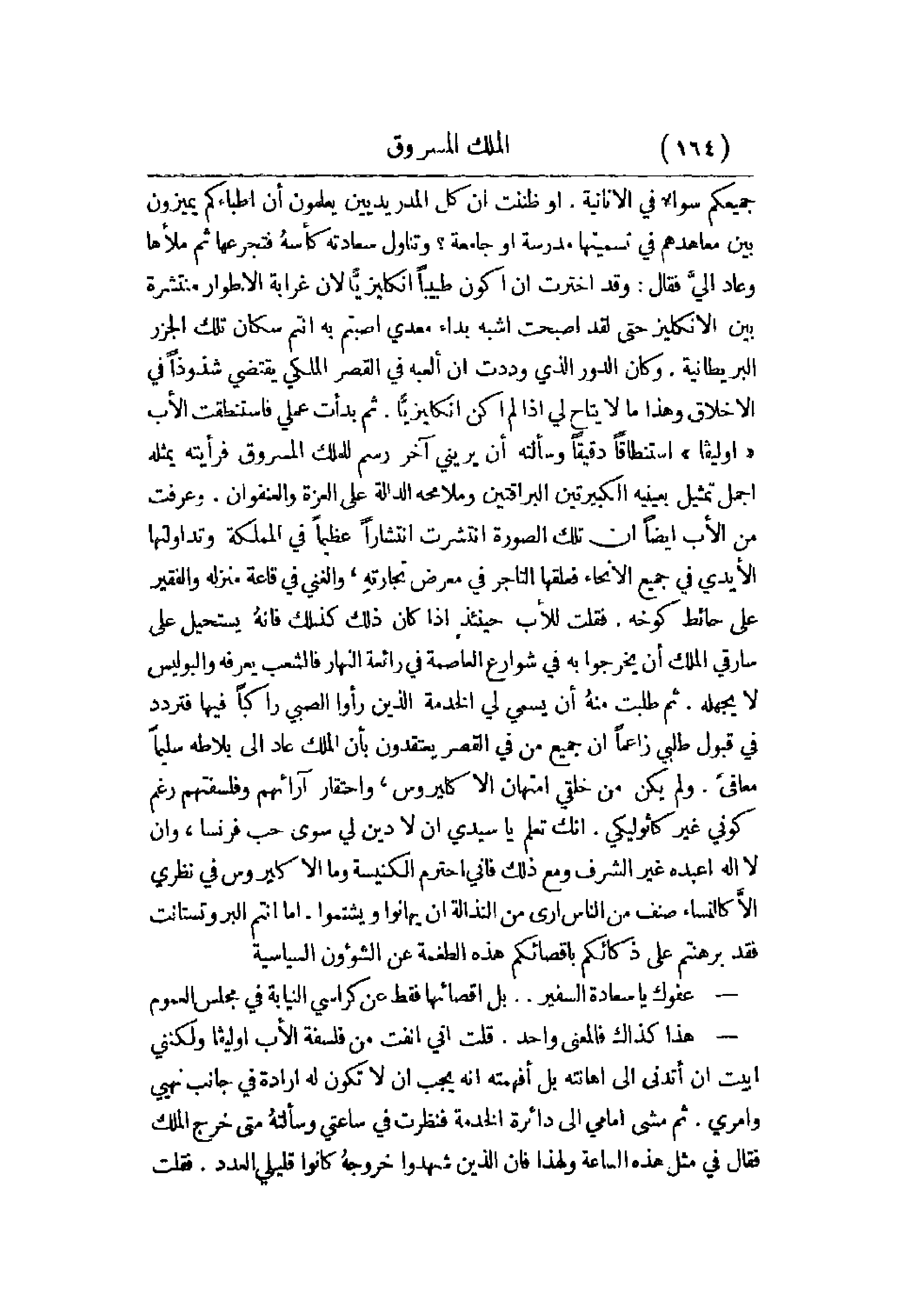 جميعكم سواء في الأنانية. أو ظننت أن كل المدريديين يعلمون أن أطباءكم يميزون معاهدهم في تسميتها مدرسة أو جامعة؟ وتناول سعادته كأسه فتجرعها ثم ملأها وعاد إلي فقال: وقد اختر أن أكون طبيباً إنكليزياً لأن غرابة الأطوار منتشرة بين الإنكليز حتى لقد أصبحت أشبه بداء معدي أصبتم به أنتم سكان تلك الجزر البريطانية. وكان الدور الذي وددت أن ألعبه في القصر الملكي يقتضي شذوذاً في الأخلاق وهذا ما لا يتاح لي إذا لم أكن إنكليزياً. ثم بدأت عملي فاستنطقت الأب أوليفا استنطاقاً دقيقاً وسألته أن يريني آخر رسم للملك المسروق فرأيته يمثله أجمل تمثيل بعينيه الكبيرتين البراقتين وملامحه الدالة على العزة والعنفوان. وعرفت من الأب أيضاً أن تلك الصورة انتشرت انتشاراً عظيماً في المملكة وتداولتها الأيدي في جميع الأنحاء فعلقها التاجر في معرض تجارته، والغني في قاعة منزله والفقير على حائط كوخه. فقلت للأب حينئذ إذا كان ذلك كذلك فغنه يستحيل على سارقي الملك أن يخرجوا به في شوارع العاصمة في رائعة النهار فالشعب يعرفه والبوليس لا يجهله. ثم طلبت منه أن يسمي لي الخدمة الذين رأوا الصبي راكباً فيها فتردد في قبول طلبي زعماً أن جميع من في القصر يعتقدون بأن الملك عاد إلى بلاطه سليماً معافىً. ولم يكن من خلقي امتهان الإكليروس، واحتقار آرائهم وفلسفتهم رغم كوني غير كاثوليكي. إنك تعلم يا سيدي أن لا دين لي سوى حب فرنسا، وأن لا إله أعبده غير الشرف ومع ذلك فإني أحترم الكنيسة وما الإكليروس في نظري إلا كالنساء صنف من الناس أرى من النذالة أن يهانوا ويشتموا. إما انتم البروتستانت فقد برهنتم على ذكائكم بإقصائكم هذه الطغمة عن الشؤون السياسية.
