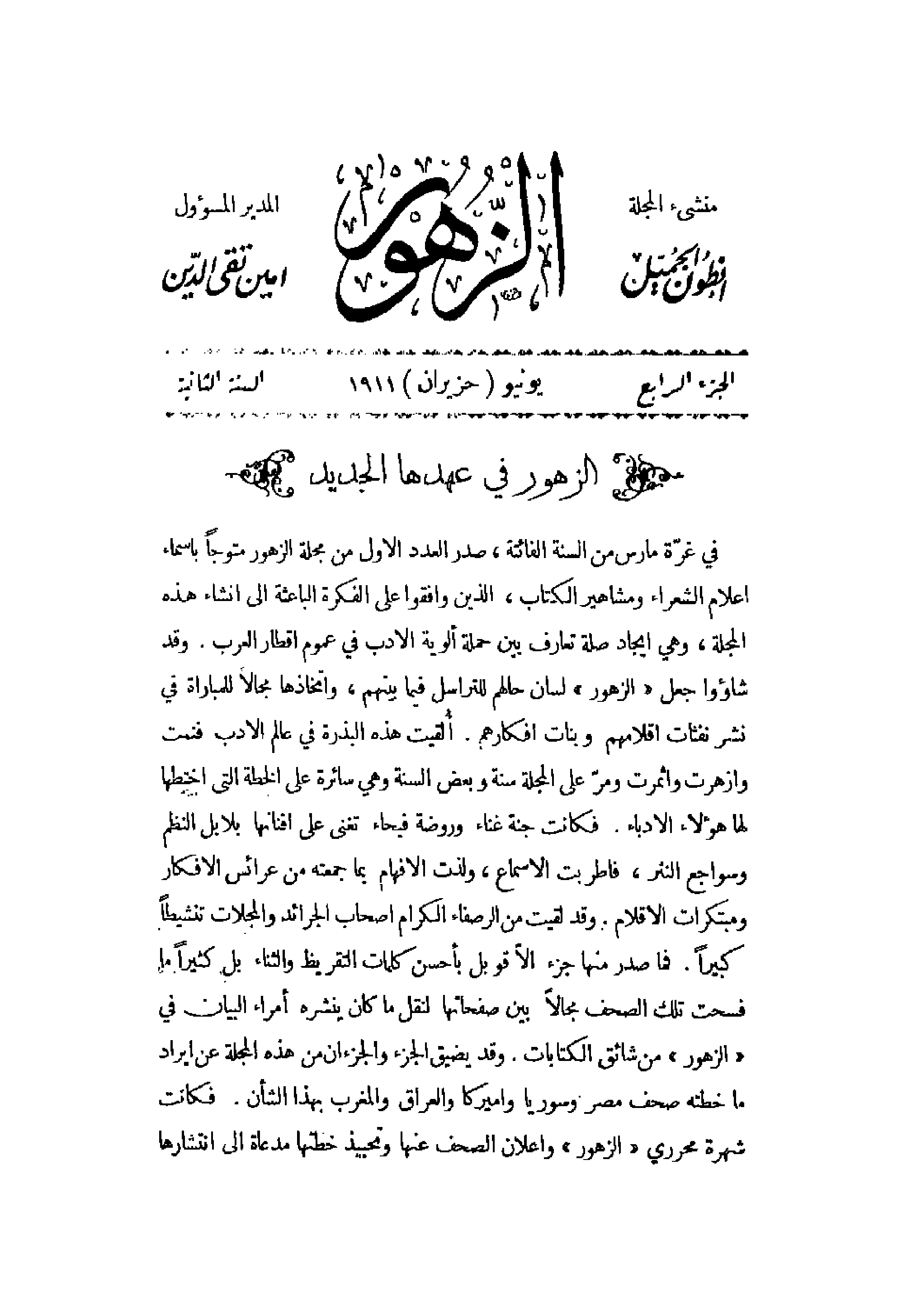 في غرة مارس من السنة الفائتة، صدر العدد الأول من مجلة الزهور متوجاً بأسماء أعلام الشعراء ومشاهير الكتاب، الذين وافقوا على الفكرة الباعثة إلى إنشاء هذه المجلة، وهي إيجاد صلة تعارف بني حملة ألوية الأدب في عموم أقطار العرب. وقد شاؤوا جعل الزهور لسان حالهم للتراسل فيما بينهم، واتخاذها مجالاً للمباراة في نشر نفثات أقلامهم وبنات أفكارهم. ألقيت هذه البذرة في عالم الأدب فنمت وأزهرت وأثمرت ومر على المجلة سنة وبعض السنة وهي سائرة على الخطة التي اختطها لها هؤلاء الأدباء. فكانت جنة غناء وروضة فيحاء تغني على أفنانها بلابل النظم وسواجع النثر، فأطربت الأسماع، ولذت الأفهام بما جمعته من عرائس الأفكار ومبتكرات الأقلام. وقد لقيت من الرصفاء الكرام أصحاب الجرائد والمجلات تنشيطاً كبيراً. فما صدر منها جزء إلا قوبل بأحسن كلمات التقريظ والثناء بل كثيراً ما فسحت تلك الصحف مجالاً بين صفحاتها لنقل ما كان ينشره امراء البيان في الزهور من شائق الكتابات. وقد يضيق الجزء والجزءان من هذه المجلة عن إيراد ما خطته صحف مصر وسورية وأمريكا والعراق والمغرب بهذا الشأن. فكانت شهرة محرري الزهور وإعلان الصحف عنها وتحبيذ خطتها مدعاة إلى انتشارها