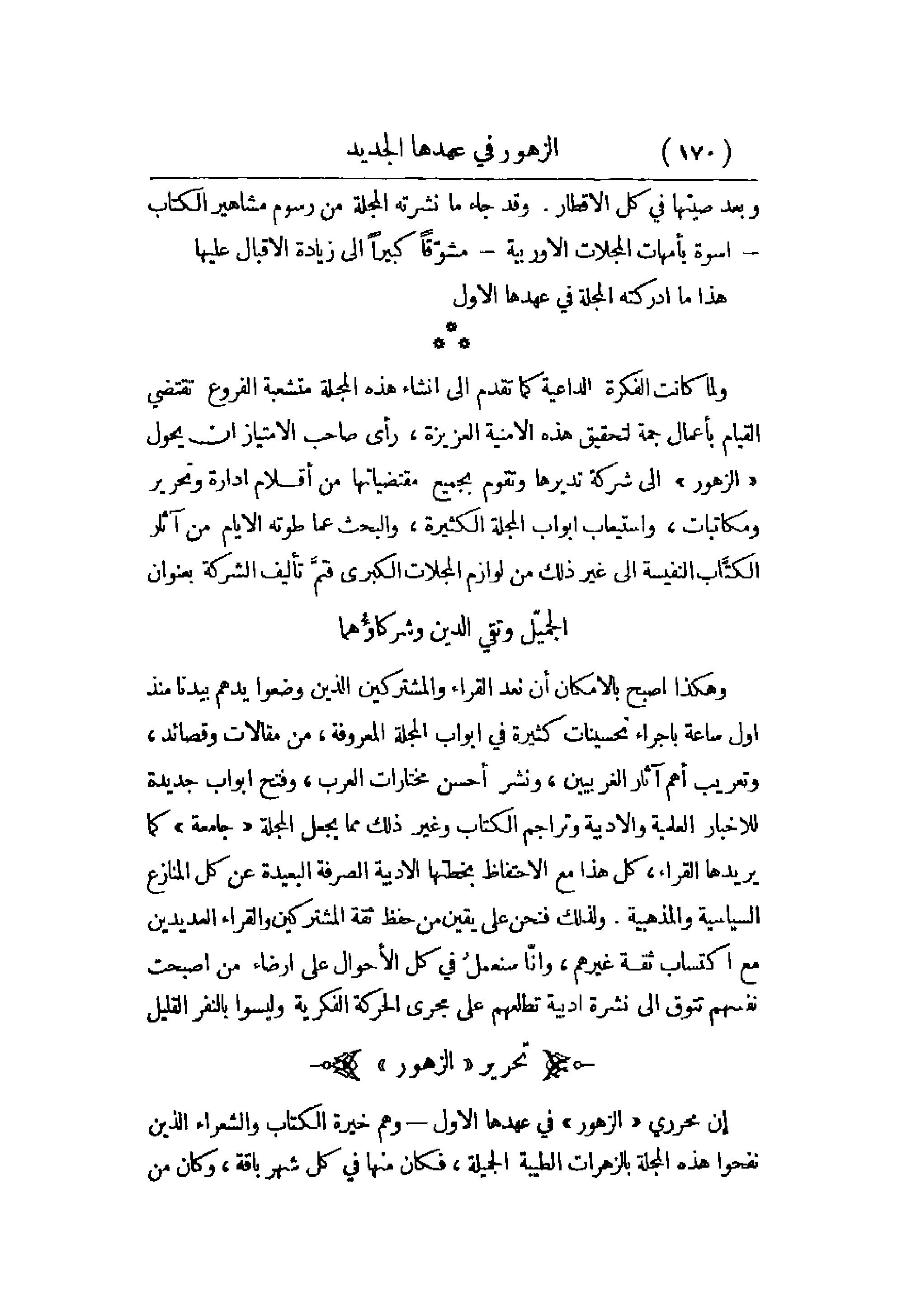 إن محرري الزهور في عهدها الأول - وهم خيرة الكتاب والشعراء الذين نفحوا هذه المجلة بالزهرات الطيبة الجميلة، فكان منها في كل شهر باقة، وكان من