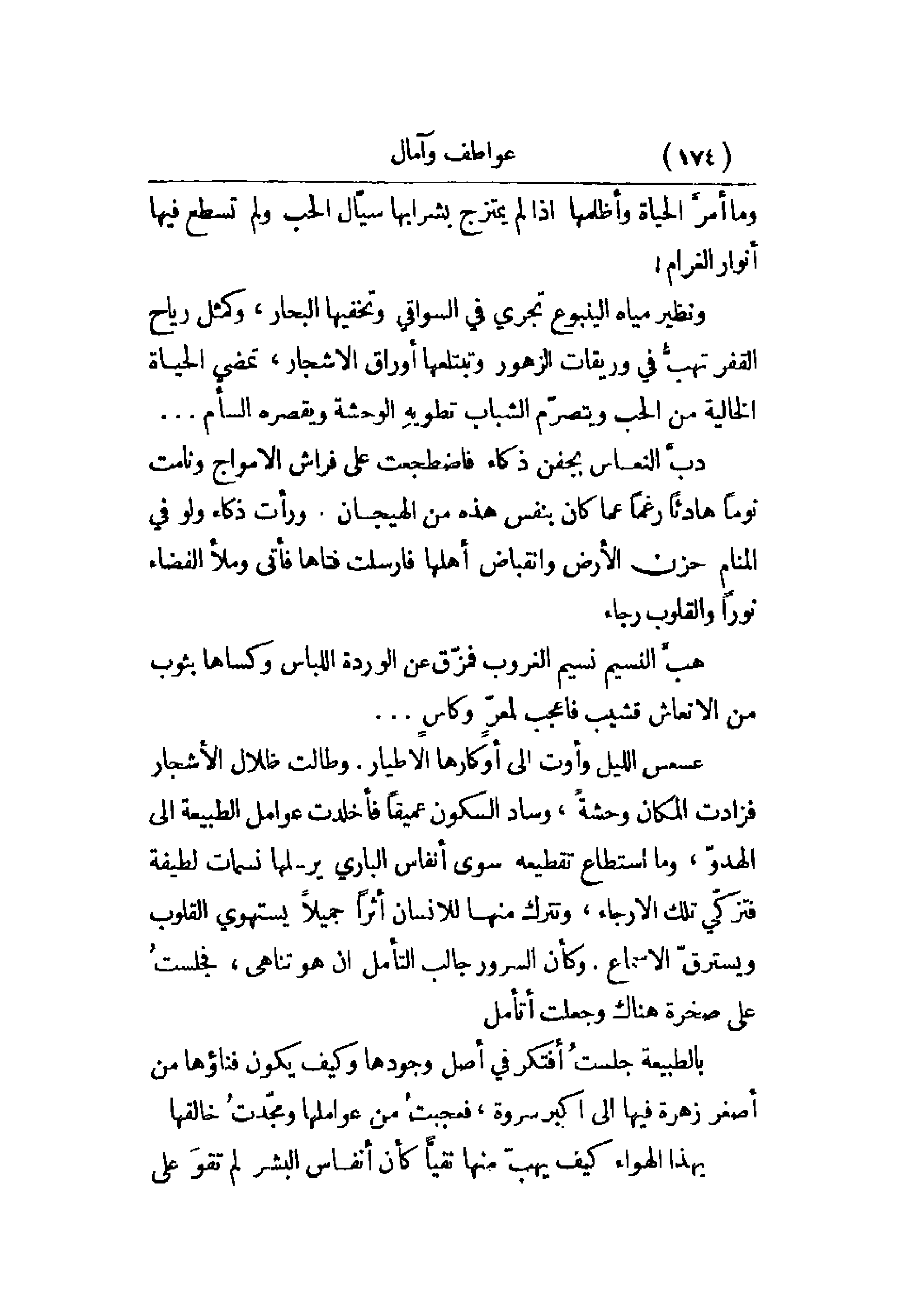 عسعس الليل وأوت إلى أوكارها الأطيار. وطالت ظلال الأشجار فزادت المكان وحشة، وساد السكون عميقاً فأخلدت عوامل الطبيعة إلى الهدّو، وما استطاع تقطيعه سوى أنفاس الباري يرسلها نسمات لطيفة فتزكي تلك الأرجاء، وتترك منها للإنسان أثراً جميلاً يستهوي القلوب ويسترق الأسماع. وكأن السرور جالب التأمل إن هو تناهى، فجلست على صخرة هناك وجعلت أتأمل.