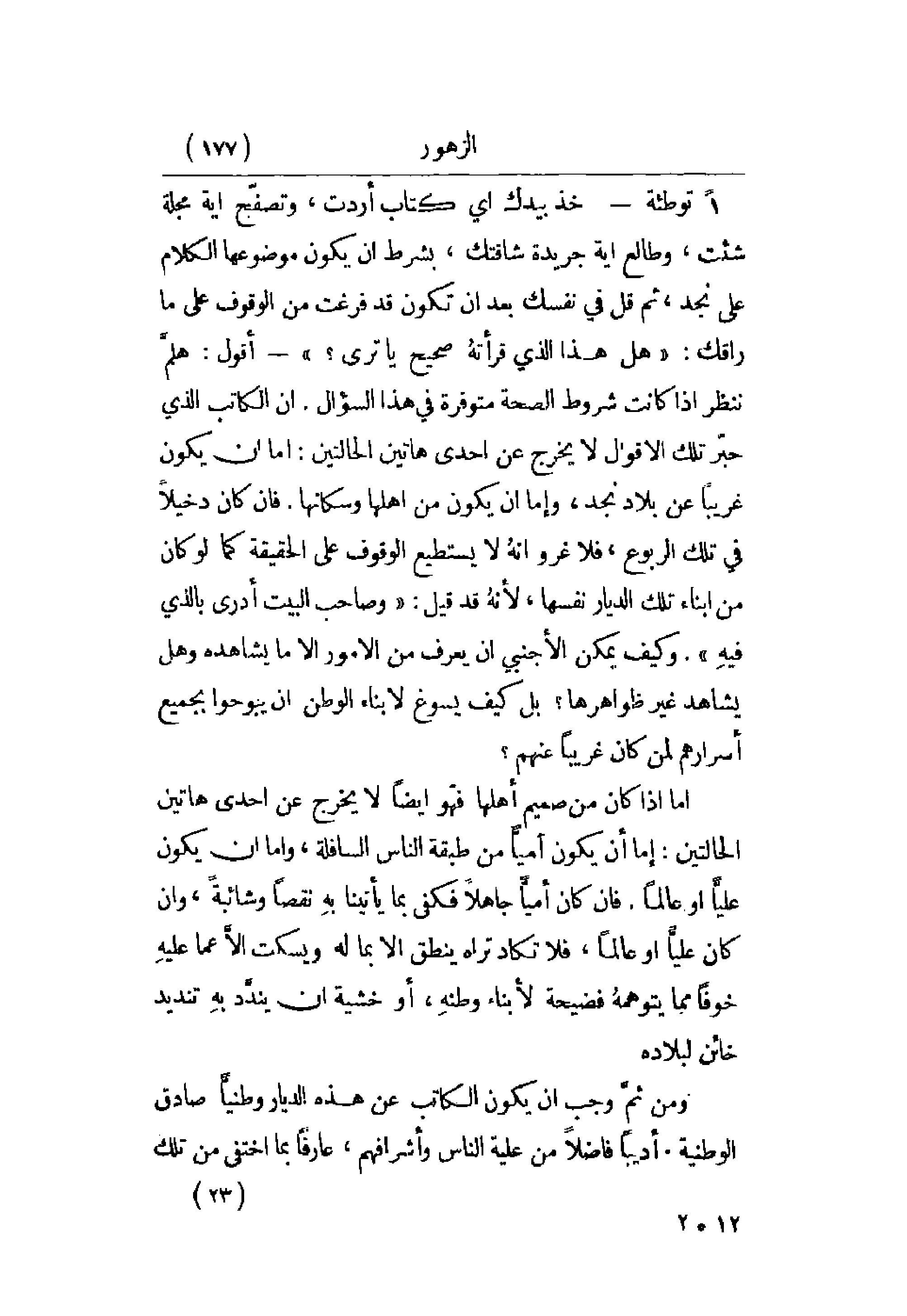 1 - توطئة - خذ بيدك أي كتاب أردت، وتصفح أية مجلة شئت، وطالع أية جريدة شاقتك، بشرط أن يكون موضوعها الكلام على نجد، ثم قل في نفسك بعد أن تكون قد فرغت من الوقوف على ما راقك: هل هذا الذي قرأته صحيح يا ترى؟ - أقول: هلم ننظر إذا كانت شروط الصحة متوفرة في هذا السؤال. إن الكاتب الذي حبر تلك الأقوال لا يخرج عن إحدى هاتين الحالتين: إما أن يكون غريباً عن بلاد نجد، وإما أن يكون من أهلها وسكانها. فإن كان دخيلاً في تلك الربوع، فلا غرو إنه لا يستطيع الوقوف على الحقيقة كما لو كان من أبناء تلك الديار نفسها، لأنه قد قيل: وصاحب البيت أدرى بالذي فيه. وكيف يمكن الأجنبي أن يعرف من الأمور إلا ما يشاهده وهل يشاهد غير ظواهرها؟ بل كيف يسوغ لأبناء الوطن أن يبوحوا بجميع أسرارهم لمن كان غريباً عنهم؟