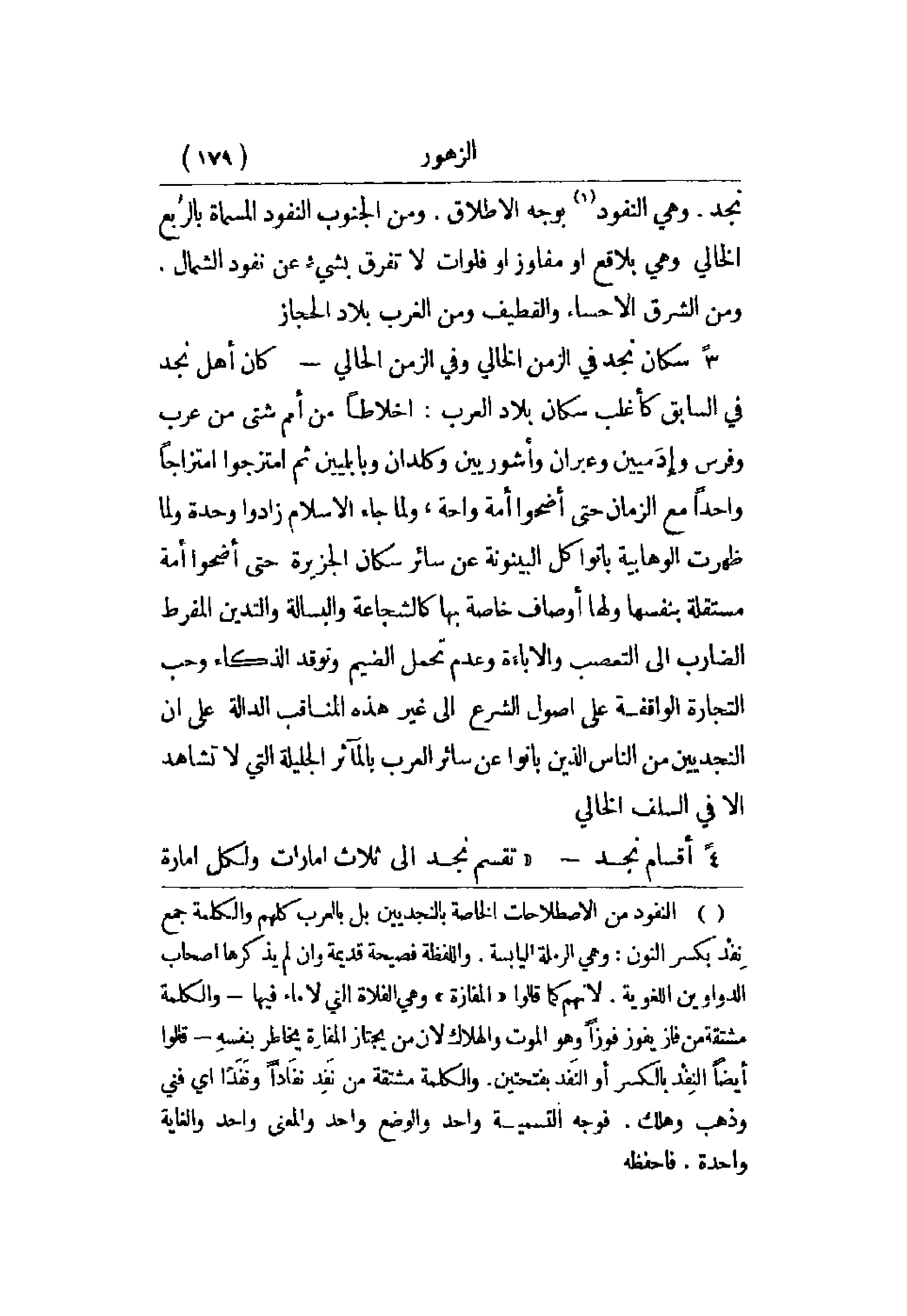 3 - سكان نجد في الزمن الخالي وفي الزمن الحالي - كان أهل نجد في السابق كأغلب سكان بلاد العرب: أخلاطاً من أمم شتى من عرب وفرس وإدميين وعبران وآشوريين وكلدان وبابليين ثم امتزجوا امتزاجاً واحداً مع الزمان حتى أضحوا أمة واحة، ولما جاء الإسلام زادوا وحدة ولما ظهرت الوهابية بانوا كل البينونة عن سائر سكان الجزيرة حتى أضحوا أمة مستقلة بنفسها ولها أوصاف خاصة بها كالشجاعة والبسالة والتدين المفرط الضارب إلى التعصب والإباءة وعدم تحمل الضيم وتوقد الذكاء وحب التجارة الواقفة على أصول الشرع إلى غير هذه المناقب الدالة على أن النجديين من الناس الذين بانوا عن